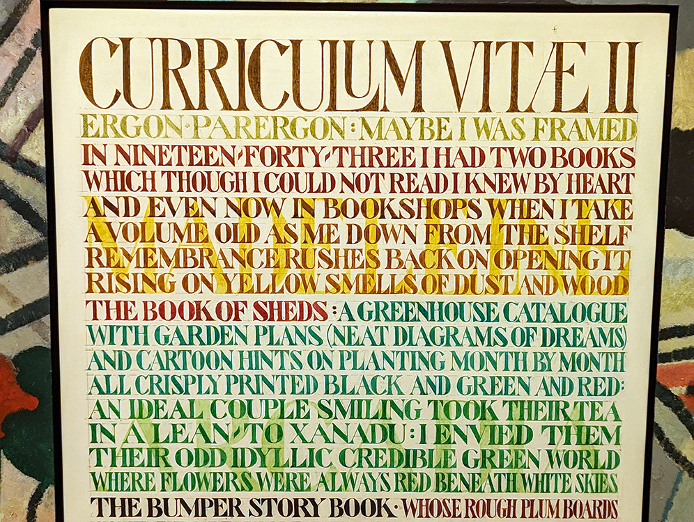 The amazing part of this is his process. Most of his “Curriculum Vitae” series is composed in iambic pentameter, a form of traditional English poetry with ten syllables per line (Yes, I learned this through labels.). Yet, they are written, or carved as it were, somewhat on the fly.