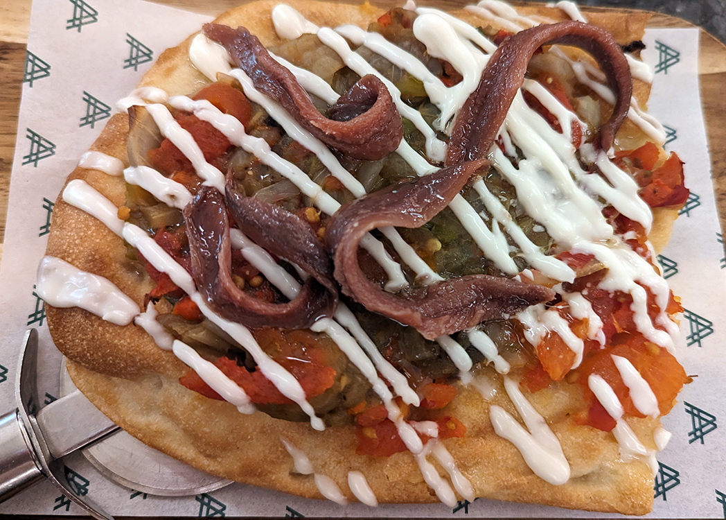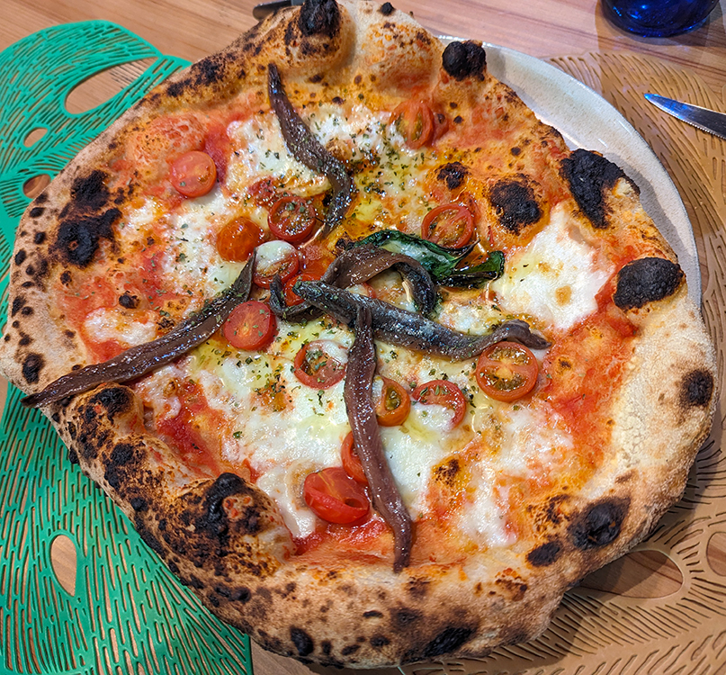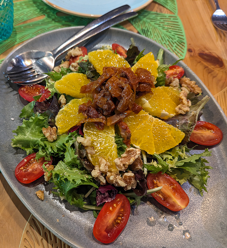 I am not trying to insult any Asturians but am sticking to my recently adopted policy of listing these alphabetically. El Curnicello Napolitano comes first. We are always on the lookout for pizza with a Neopolitan-style crust and found one here. The generous salad combined lettuces with fresh tomatoes, sun-dried tomatoes, oranges, walnuts and parmesan. Plus, never turn away from good luck; cornicello is a horn-shaped charm worn to ward off the evil eye. Maybe I should carry one.