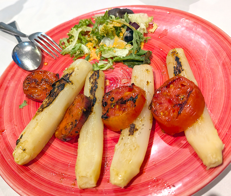 We dropped into Sidrerias El Bosque on our first night, and, now that I’m finally organizing photos, I wish we’d gone back for more zamburinas and padron chiles. The grilled white asparagus were jarred, which is acceptable in Spain as the vegetable has such a short growing season but seemed mushy to us. But those scallops and chiles are highly recommended.