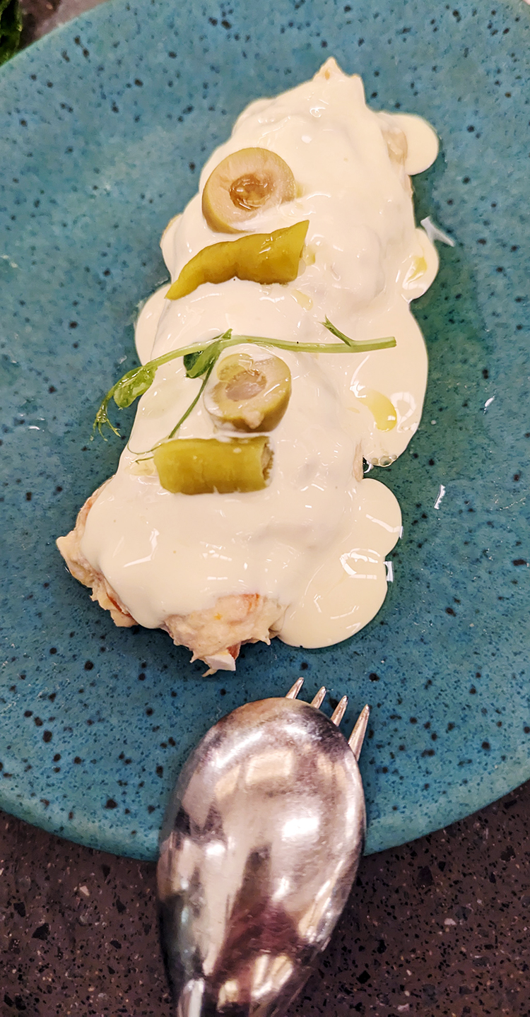Cachopo marinero is a completely different dish than the beef cachopo. Two pieces of pan-fried hake are stuffed with seafood, including gulas. Gulas resemble thin chopped spaghetti but are a relatively new product mimicking a Basque delicacy, elvers, or baby eels.