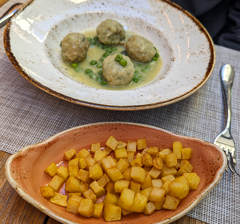 So, here is a description of our “unique gastronomic experience.” An amuse-bouche is a gift, so one shouldn’t be harsh about it. Each of us were presented with a nice, plump shrimp in what appeared to be pico de gallo. Unfortunately, chiles did not make their way across the ocean, a nice shrimp in a sea of blandness. The balls of rape, or monkfish, in a mild leek sauce were okay, but we found no reason to spear more than one of the flavorless cubed potatoes presented on the side. A bronzed pastel of leeks and shrimp “gratinado al cava” appeared appetizing. My apologies because the cheese used is probably a prized Asturian one, but the resulting sauce resembled Tex-Mex chile con queso sin chiles.