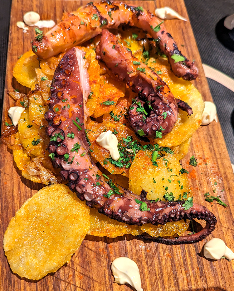 Tierra Astur focuses on its cider, and how it is presented; Asturian products; and keeping its woodfire grills going. Grilled octopus was cooked perfectly, and the impossible-to-finish-sized serving of setas, large mushrooms found in forested areas, seared to the point of caramelizing.