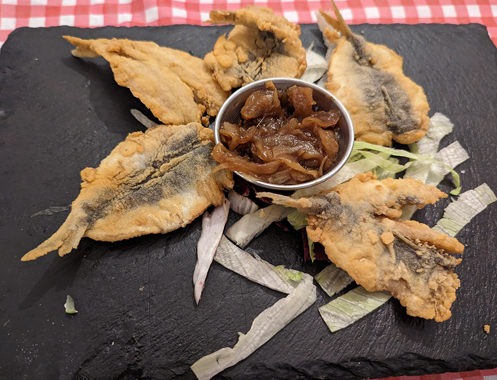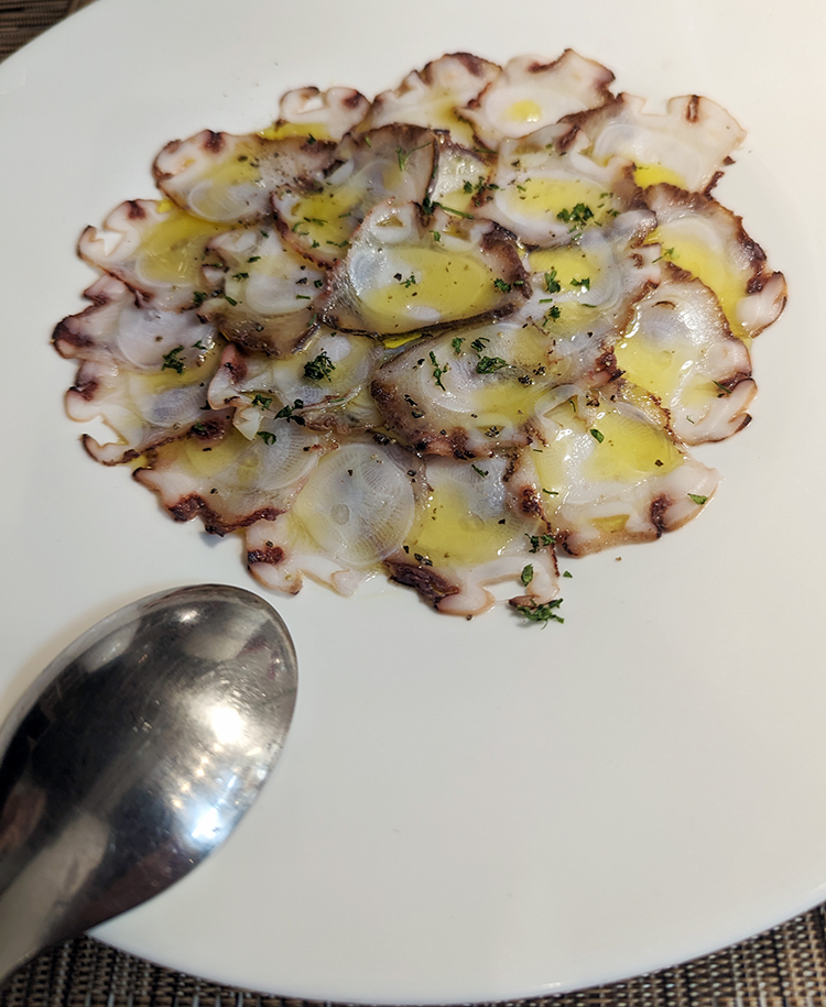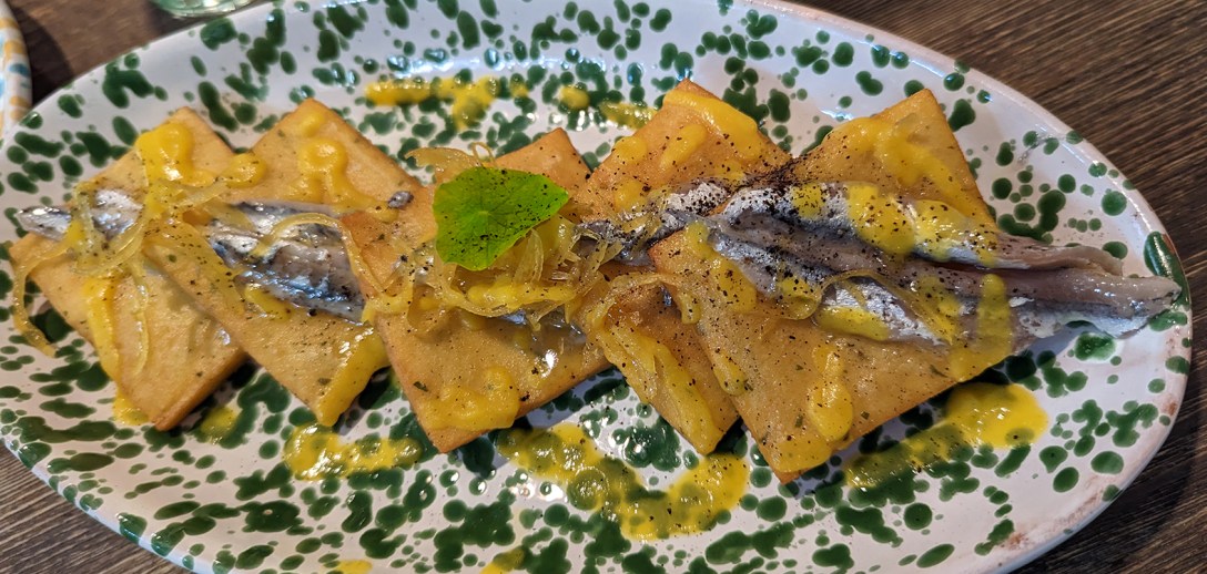 We rarely strayed from seafood, such as an amberjack tartare appetizer with artichoke hearts and candied lemon peel, or fried sardines and anchovies with caramelized onions on the side. Pastas sampled included shells with a fish ragu; fish-filled tortelloni; fried ravioletti with curried zuchini; and dumpling-like culurgiones with potatoes, mint and pecorino cheese inside. The fried swordfish spiedini kabob arrived plated with refreshing pumpkin carpaccio.