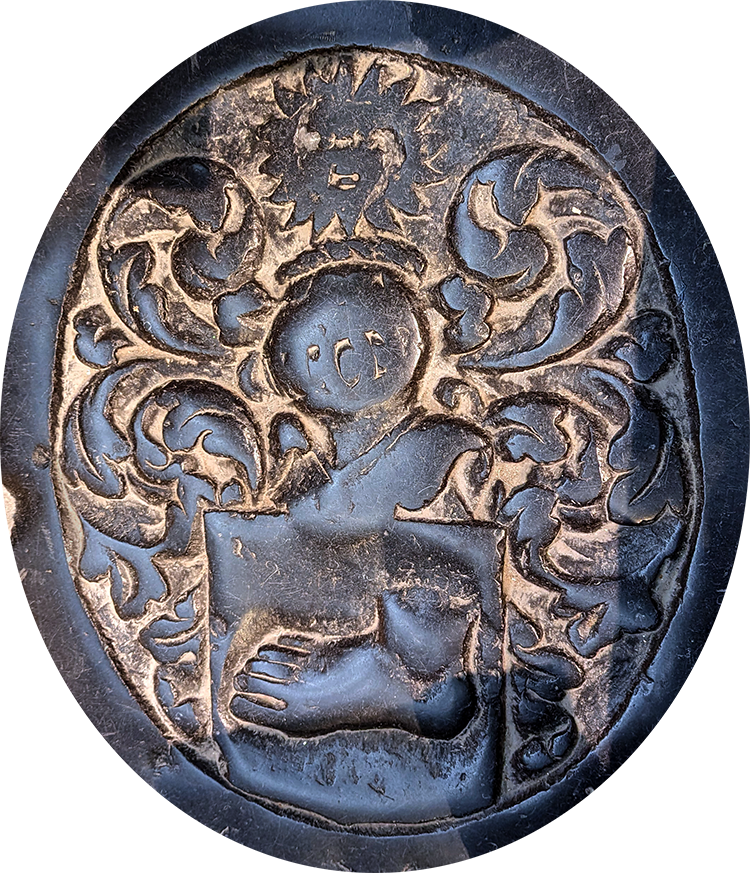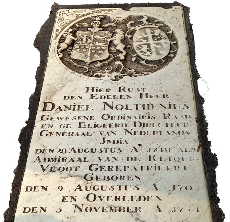 Photo flanked by images of tomb markers embedded in the floor of the New Cathedral.