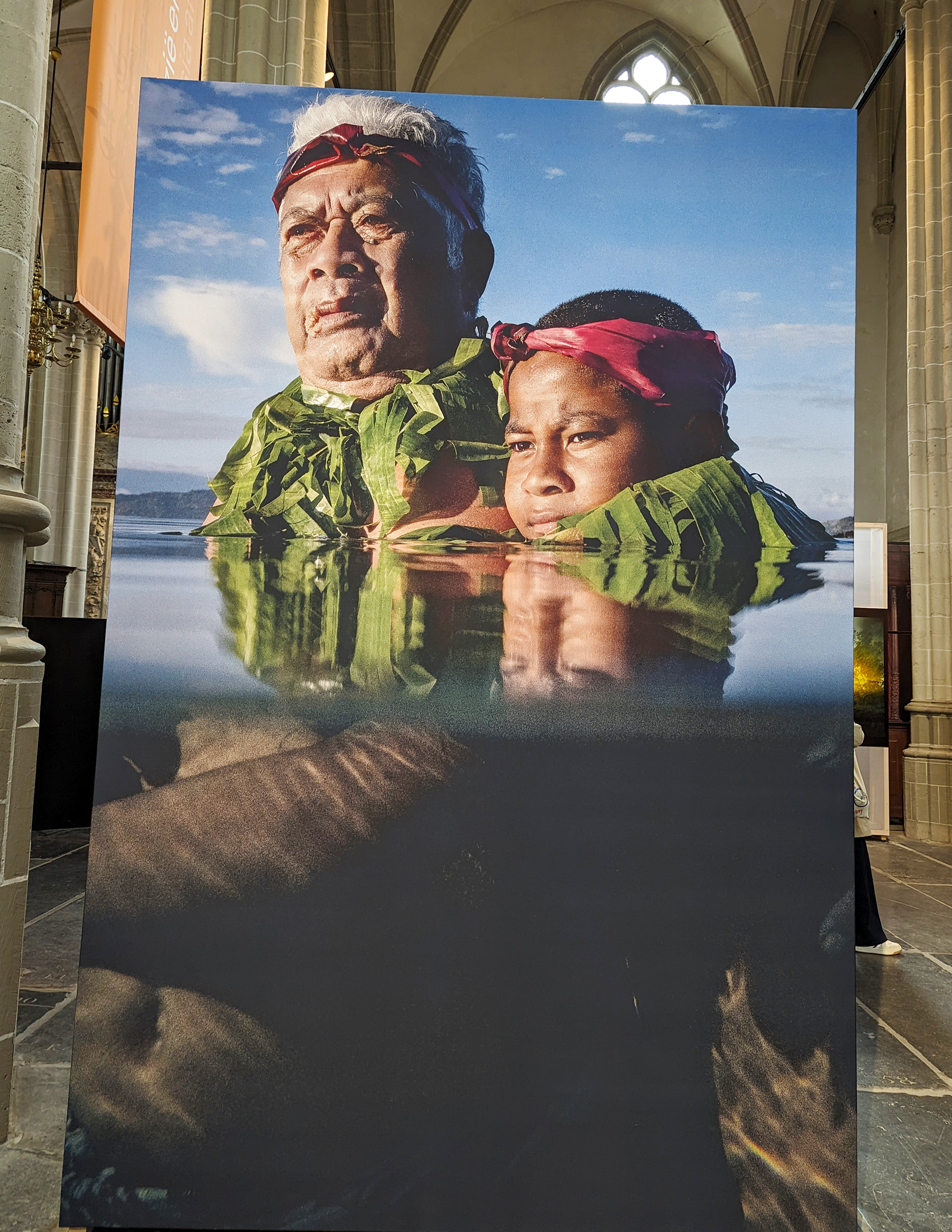 Above center: World Press Photo Contest, Southeast Asia and Oceania, Singles, “Fighting, Not Sinking,” Eddie Jim, The Age/Sydney Morning Herald. “Lotomau Fiafia (72), a community elder, stands with his grandson John at the point where he remembers the shoreline used to be when he was a boy. Salia Bay, Kioa Island, Fiji.”