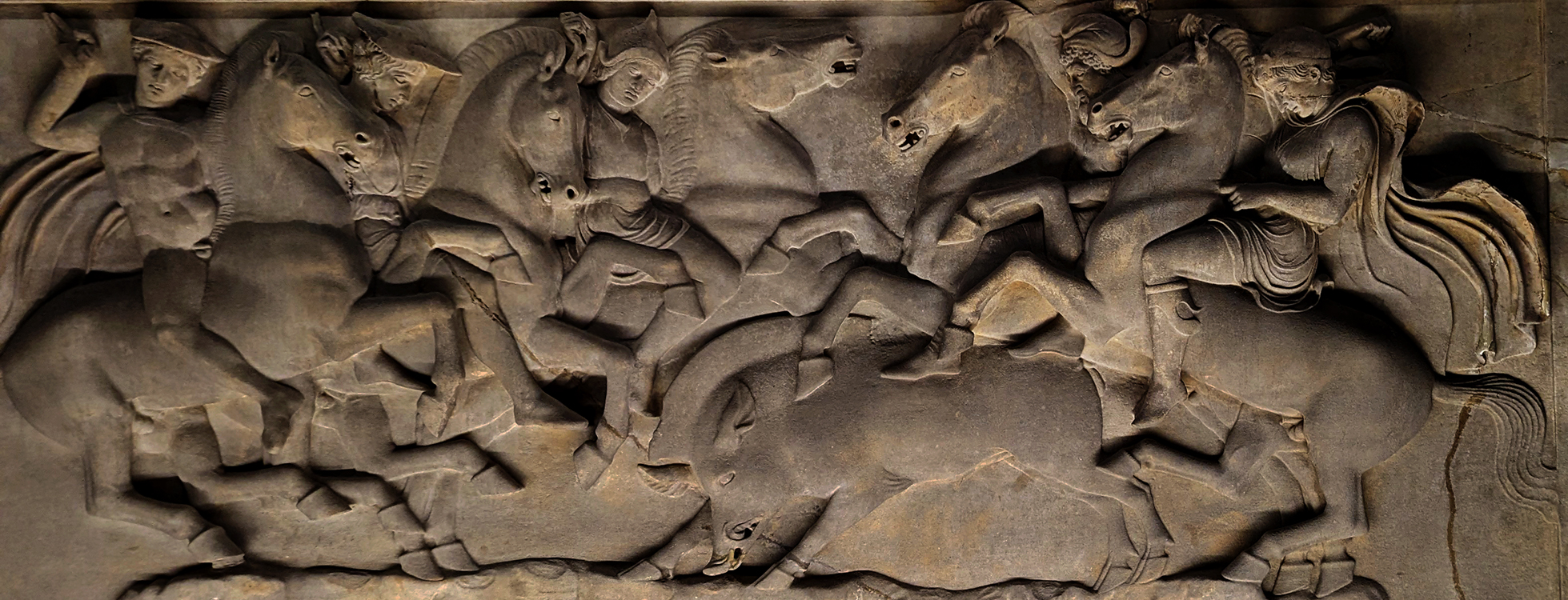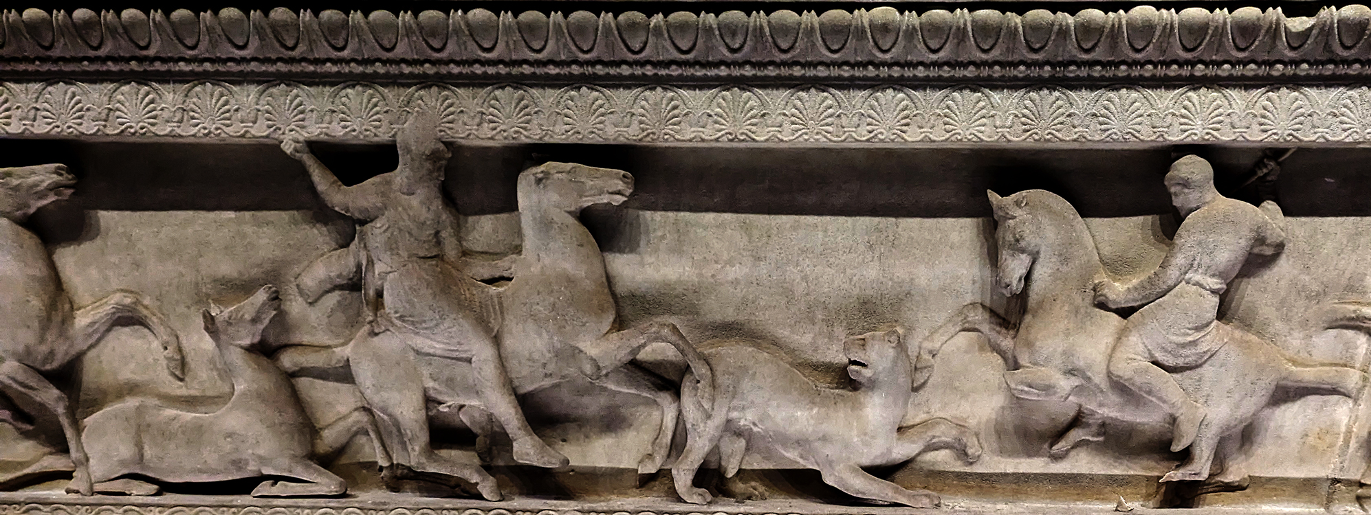 Above: Detail of a lion hunt on the Alexander Sarcophogus, brought from Saidi to Istanbul in 1887, shows traces of polychrome once brightly coloring it.
