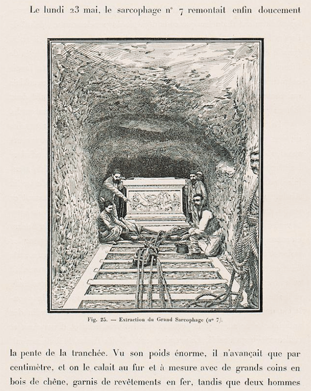 The process of raising the weighty tombs from their underground chambers was complicated and laborious. The curator supervised the construction of a straight, long and gently sloping tunnel from the chamber to the surface. Wooden rails were built inside the tunnel, and ropes were employed to extract them on sledges made by Saida shipbuilders. Construction of a roadway to the port was necessitated before shipping the sarcophagi to Istanbul.
