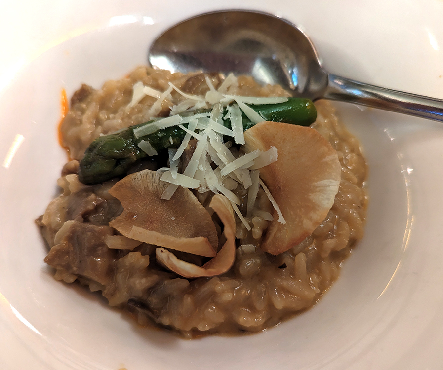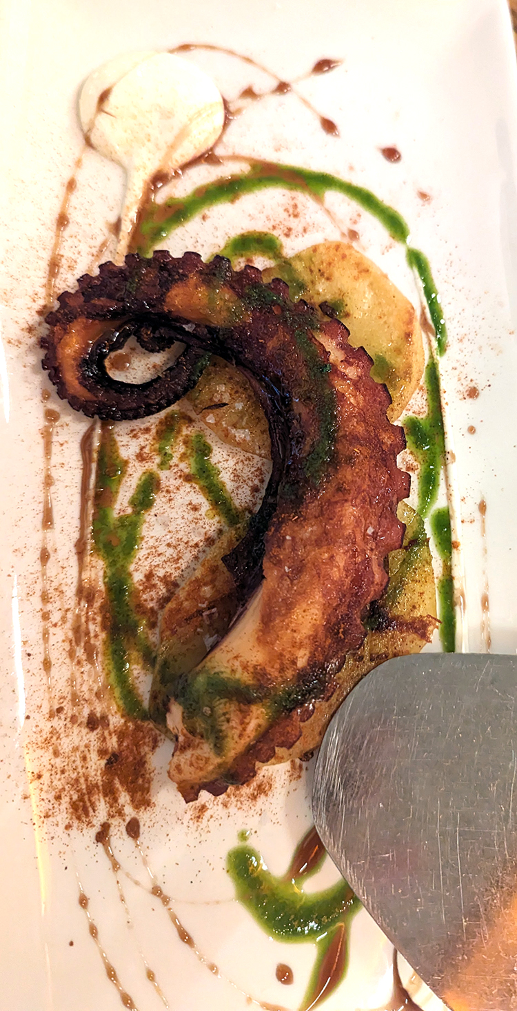 Aside from fried, the grilled pulpo was moist and tender, with just the right amount of caramelizing char around its edges. The highly reduced sauce enhanced the falling-apart-tender oxtails, and large seta boletos added a woodsy richness to an order of risotto. A rice pudding foam covering caramel ice cream proved a refreshingly light dessert.