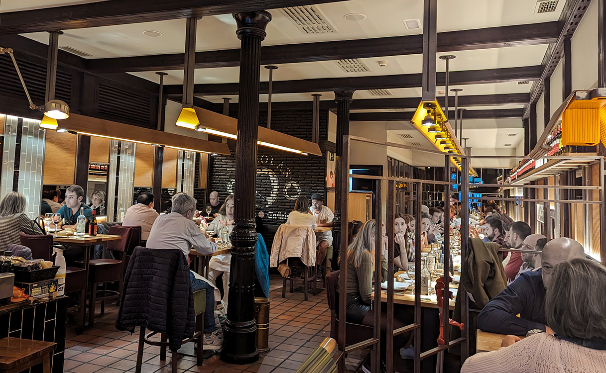 The interior of Nicolas Restaurante was sleekly contemporary, with mirrors brightening the beamed interior. Reflecting on these photos, I’m realizing how much fried food I order in Spain. It tends to be perfectly cooked and non-greasy to the point it seems light. Below you see some of the evidence of my fall into decadence – calamari, croquetas and padron chiles. I promise these were not all consumed during one visit.