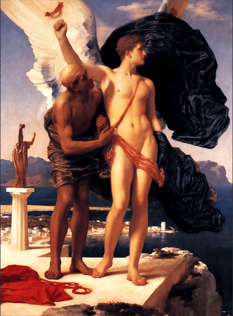 “In the 19th century, artists and writers increasingly used mythological subjects to sublimate – but also covertly express – homoerotic desire. A good example is Frederic Leighton’s painting of the elderly Daedalus attaching wings to Icarus, from around 1869. The theme and the younger man’s pose are classical…. Far from acting as a foil for sensuality, the classicism of this scene radiates eroticism: it is more than simply a picture of paternal solicitude.”