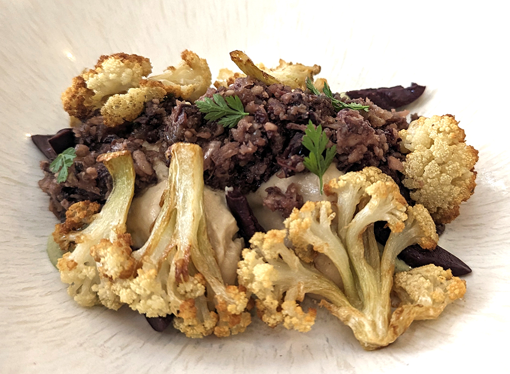 An endive salad was topped with ultra-thin slices of coppa ham and almonds, while tender cauliflower was paired with olives and fresh chervil. Shredded parmesan hides a serving of beet ravioli, and that shiny beige mound that appears to be a dessert is actually whipped up roasted parsnips, as good as a dessert. The rectangular dark wedge is Cochon Noir Gascon, meat of the highly prized black pig of the high Pyranees. This tender pork arrived with wedges of panisse and spinach.