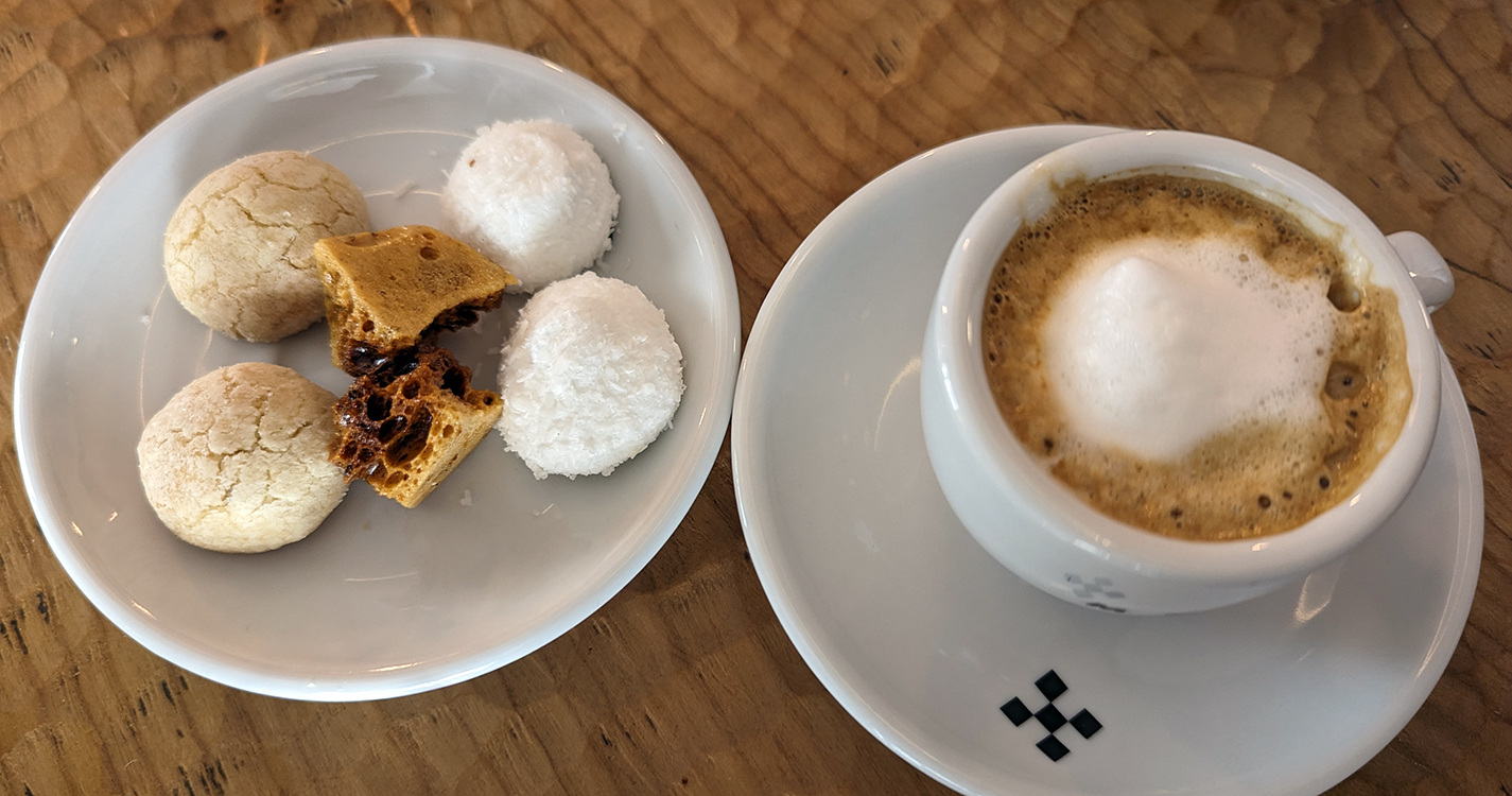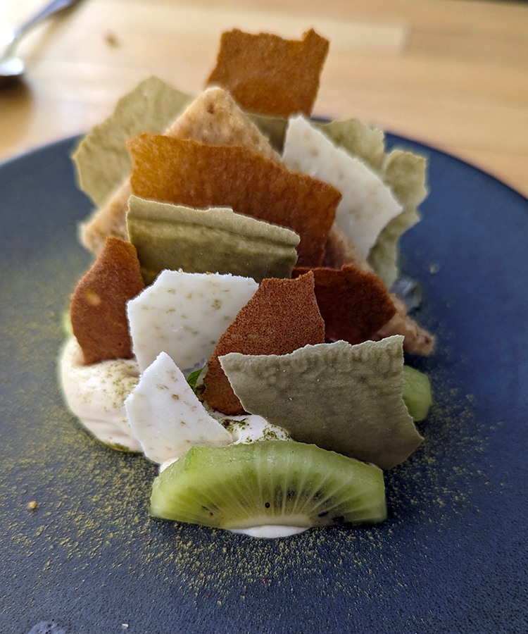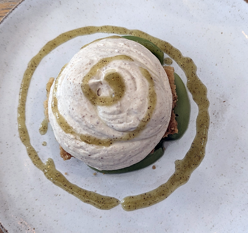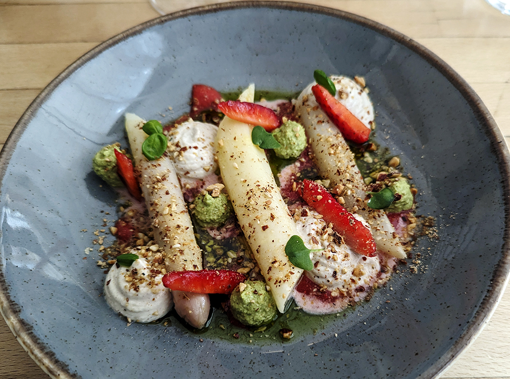 In addition to the polenta and asparagus above, we enjoyed plump white asparagus atop a coulis with vegan ricotta. A farro risotto featured glazed spring vegetables. A citrus vegan whipped cheese accompanied hazelnut shortbread and fresh kiwi. If time had been on our side, we definitely would have returned.