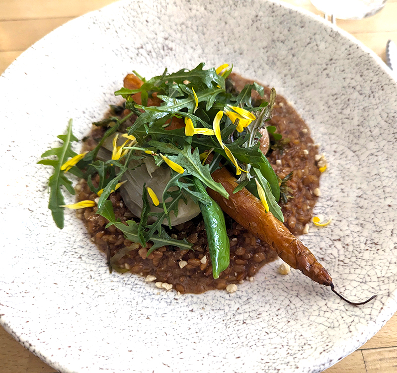 Above: Polenta and asparagus buried below a mound of fresh leafy ‘weeds’ at Les Mauvaises Herbes