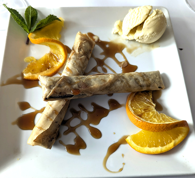We found ourselves hankering for Vietnamese food and filled the need at L’Etoile d’Asie. Crispy rice cake rolls were filled with crab and shrimp, with lettuce and fresh basil for wrapping them into finger food. We both selected banh xeo, crispy crepes of rice flour and coconut milk stuffed with pork and shrimp. For dessert, a glass of sorbet with vodka and mint was refreshing, while slender chocolate rolls were overly sweet.