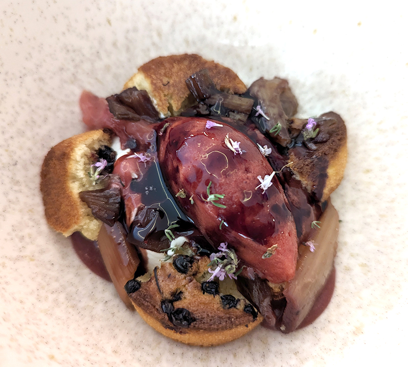For our mains, caramelized pork perched upon a bed of beans, dandelion and horseradish. Yellow pollock floated on a raft of fresh green peas garnished with Mediterranean fish eggs. A roasted (I think) rhubarb dessert was seasoned with fresh thyme and accompanied by an assortment of other red berries, while honey sweetened an apple tartelette. This type of French-with-a-Mediterranean-accent fusion should not be refused.