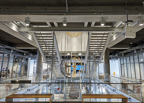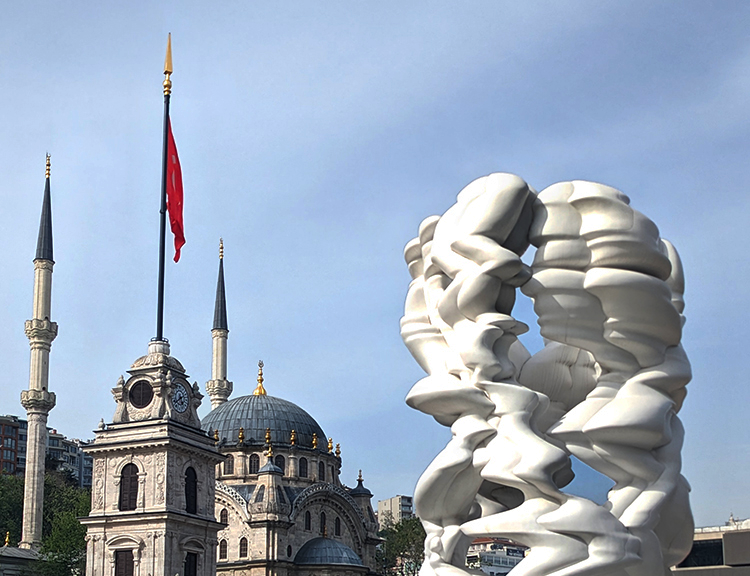 Above top left: The 1826 Nusretiye Mosque next to Istanbul Modern’s sculpture, “Runner,” Anthony Cragg, 2017. Right: View from museum terrace. Bottom: Mezzanine level inside Istanbul Modern.
