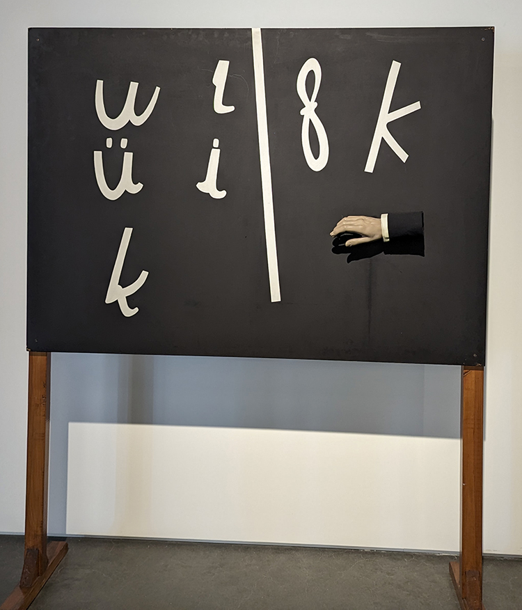 As a foreigner, the blackboard in the postage stamp at the top of this post and in the photo below had little meaning, but any schoolchild in Turkey would know its significance. Aydan Murtezaoglu (1961-) based it on a famous 1928 image of Mustafa Kemal Ataturk (1881-1938) unveiling a new, simplified Turkish alphabet to replace traditional Arabic script. Traditional Arabic script still is found on the innermost walls of mosques. The blackboard is symbolic of the separation of church and state, a line increasingly blurred in today’s landscape.