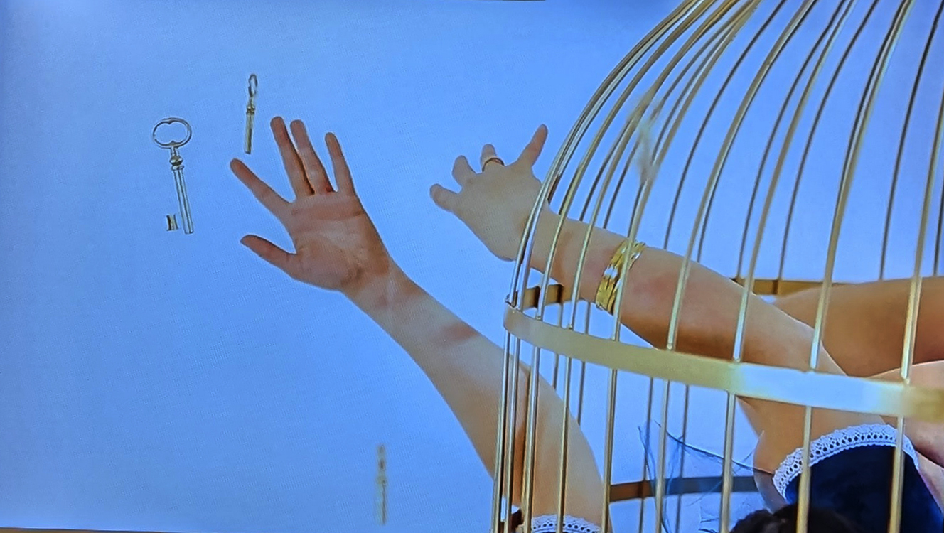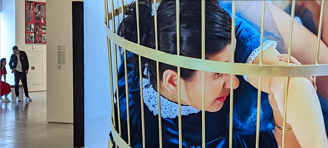A large projection screen dominating a gallery in Istanbul Modern Art Museum confronts you with a discomforting cage, a performance art piece by Nezaket Ekici (1970-), wearing an Alice-in-Wonderland-style dress.