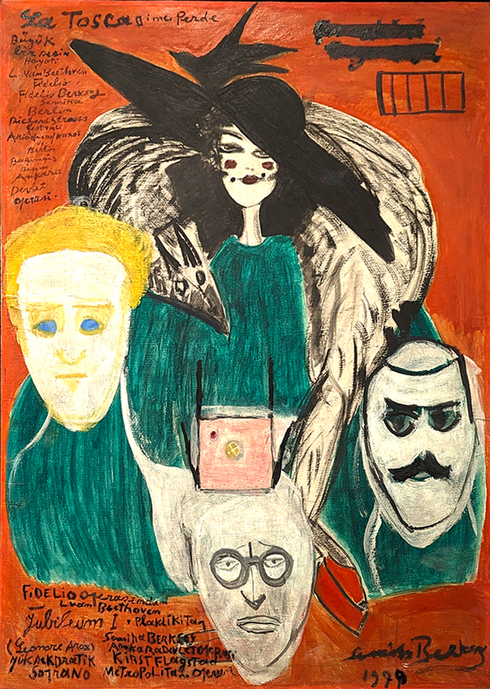 Semihi Berksoy painted self-portraits or included herself, her family, and her friends from the art world in her paintings. She interwove the characters she portrayed on stage… with her life with art; she interwove reality with dream in a poetic and tale-like style…. Berksoy’s works offer information, references, and codes for understanding not just her art but also the history of culture and arts in Turkey.”