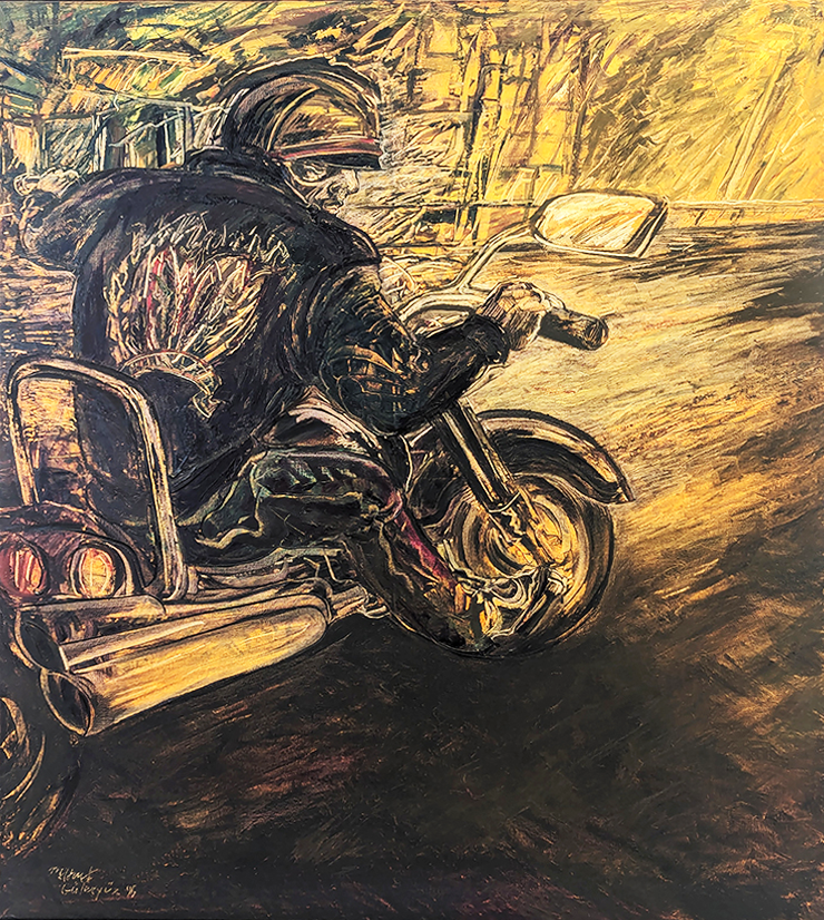 Above left: “Motard III,” Mehmet Guleryuz (1938-), 1996. Middle: “Arture 587,” Yuksel Arslan, 2004. Right: Detail of Guleryuz’s “Motor Car.”