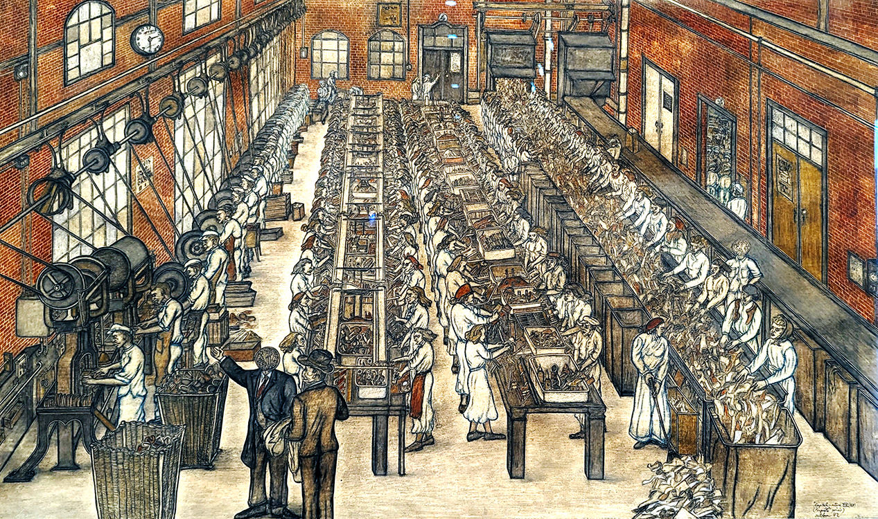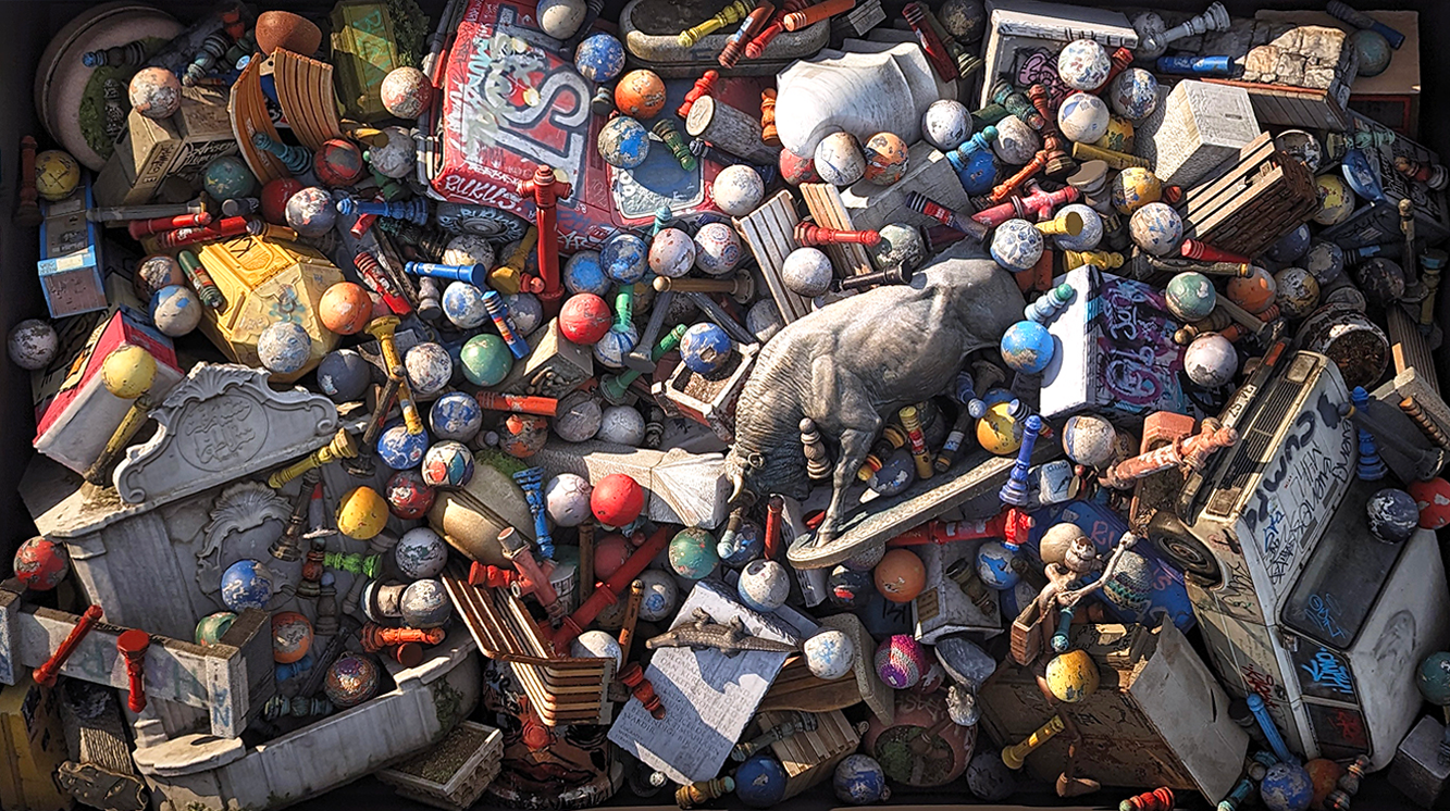 In ‘Arture 167, The Capital XVI, (Private Property),’ Yuksel Arslan visualizes the effects of capitalist production processes on society and individuals through symbolic language. Based on Karl Marx’s ‘Das Kapital,’ the artist depicts hundreds of workers in a mass-production factory as standardized beings like the products they produce and industrialists as mere representations of their ideologies with coins in place of their faces.”