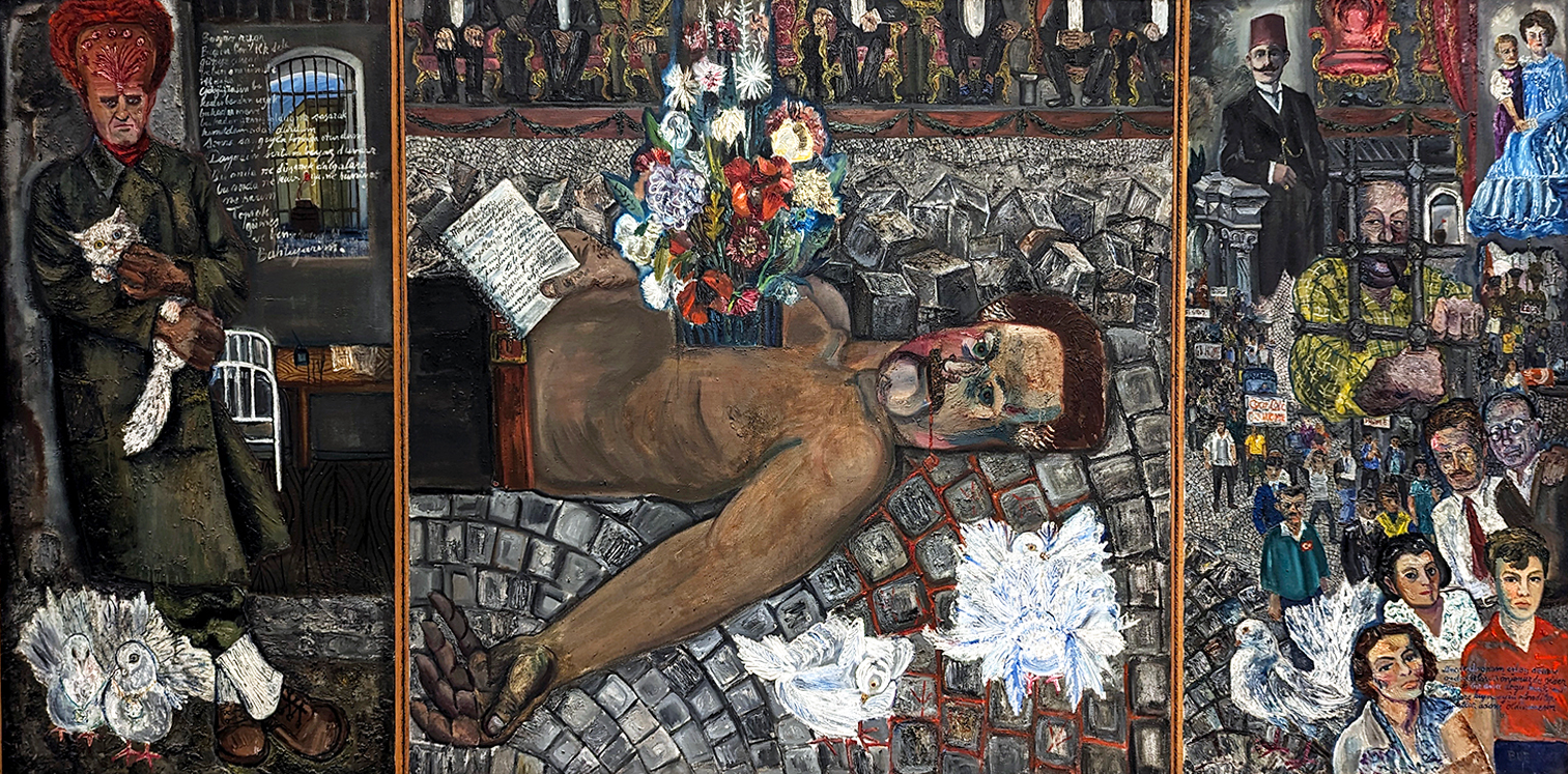 Cihat Burak’s subject is a memorial to the ‘romantic revolutionary’ poet Nazim Hikmet…. in prison, wrapped in a green coat, his head swollen with lines of poetry. Flowers and birds, normally lighthearted motifs, are here weighted down by unrequited love…. The center panel, showing his dead body, suggests he was killed in a street riot… although he actually died of a heart attack in 1963. The cobblestones are uprooted as though waiting for a revolution, and the pastiche of imagery from the past and the present gives the work a surrealist sensibility. At the top of the third panel Hikmet is portrayed as a young man wearing an Ottoman fez…. but perhaps the most striking figures are those that Burak perceives as carrying on the legacy of protest long after Hikmet’s death.”