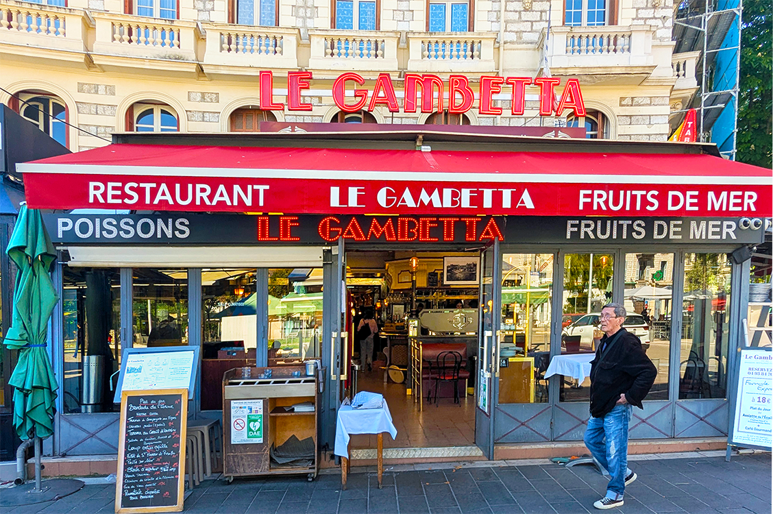 In his memory, I’m kicking off the alphabetical restaurant recognition from our stay in Nice with oysters devoured in a brasserie known for its seafood since 1923. Reaching Brasserie Le Gambetta requires a walk inland, away from the tonier French Riviera areas. It’s located in the midst of the bustling Liberation Market, a foodie destination in its own right.