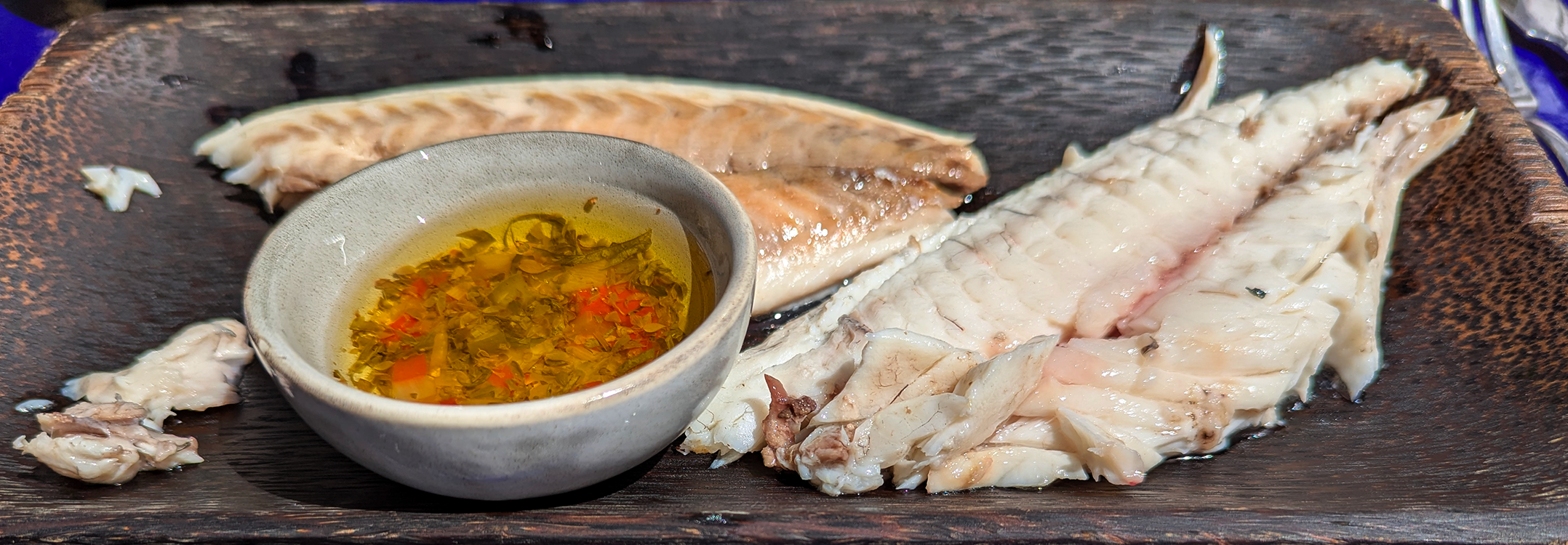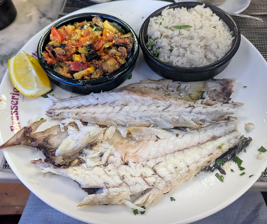 The Portuguese name of Peixes reflects the South American accent applied to Mediterranean seafood. There are two locations, and we were pleased with the freshness of the output at both. We didn’t manage to work our way completely through the menus, but I’ll list things we sampled that are pictured below: oysters Fine de Claire; white fish ceviche; fried little whitefish; and wonderful acras de morues, or cod fritters.