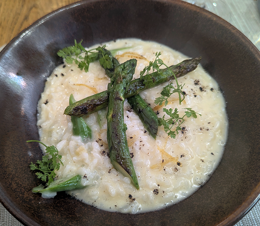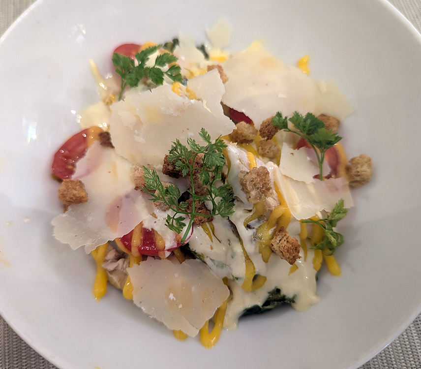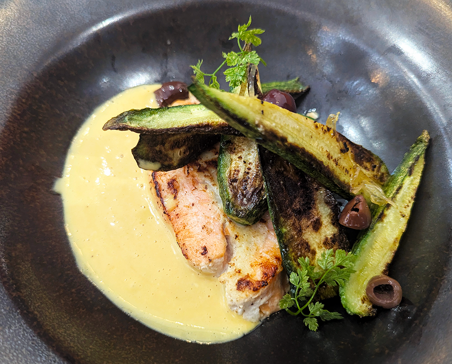 The menu at L’Alchimie varies depending on what’s in season, with three choices for each course. I doubt there are ever any wrong choices. Our starters were a large shrimp raviole afloat in a foamy coconut Tom Ka Kai bouillion; and a Cesar salad with chicken. Rolled salmon was nicely sauced alongside seared zucchini. Citron confit brightened up a luscious bowl of creamy risotto.
