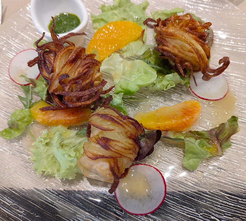 There’s a refined Asian touch in atmosphere and presentation that belies the name of the restaurant Les Deux Canailles, or The Two Scoundrels. Mixed seafood sushi amused our bouches, while we awaited our entrees. A delicate, crispy potato crust robed a shrimp starter. The second entree we selected was a carpaccio of a duo of fish du jour, with sweet, thinly sliced fish crowned with a fennel citron salad and marinated eggplant.