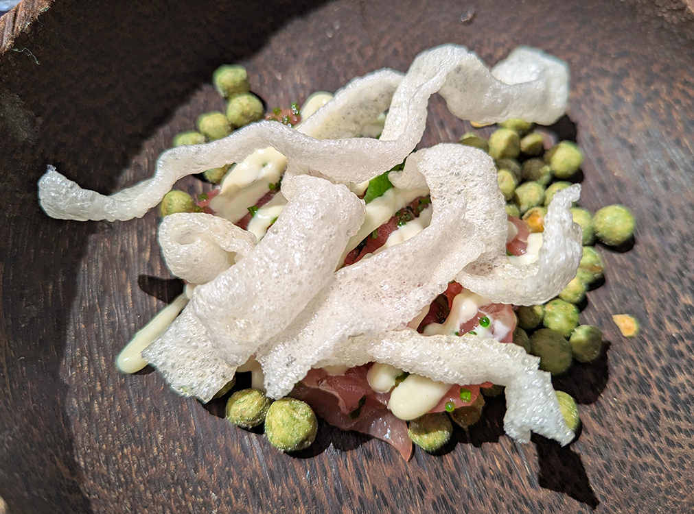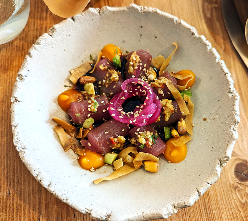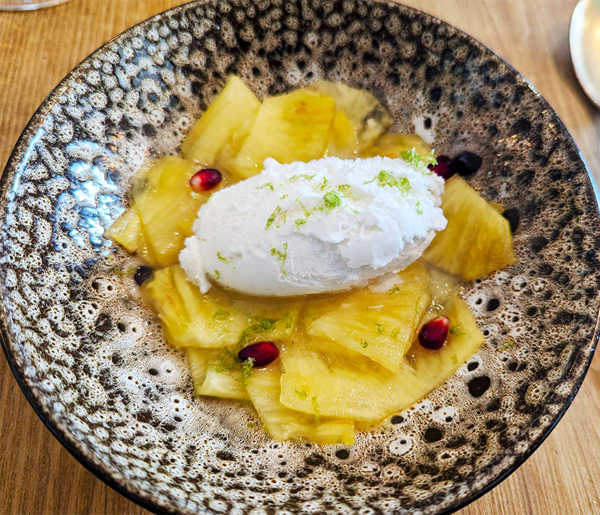 We sampled three ceviches. Ceviche maracuya consisted of salmon with a passion fruit leche de tigre. Tartare Nikkei featured tuna, ponzu mayonnaise, cucumbers, avocado and fried nori, or seaweed. Daurade in ceviche ruibarbo was flavored by a rhubarb leche de tigre and popped quinoa. A double chocolate dessert with dulce de leche and cocoa-chocolate crumble was on the sweet side for us. Thinly shaved pineapple with a yogurt ice cream and candied lime peel was just right.