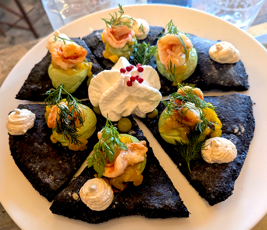 Pizza au charbon noir at Type 55 shatters every Neapolitan rule defining pizza. With dough blackened by charcoal, Type 55 assembles each individual piece in its distinctive deconstructed style. Take the one below: avocado cream, mango, shrimp, fresh sorrel and smoky whipped stracciatella cheese. The kitchen also turns out non-charbon pizzas as well.