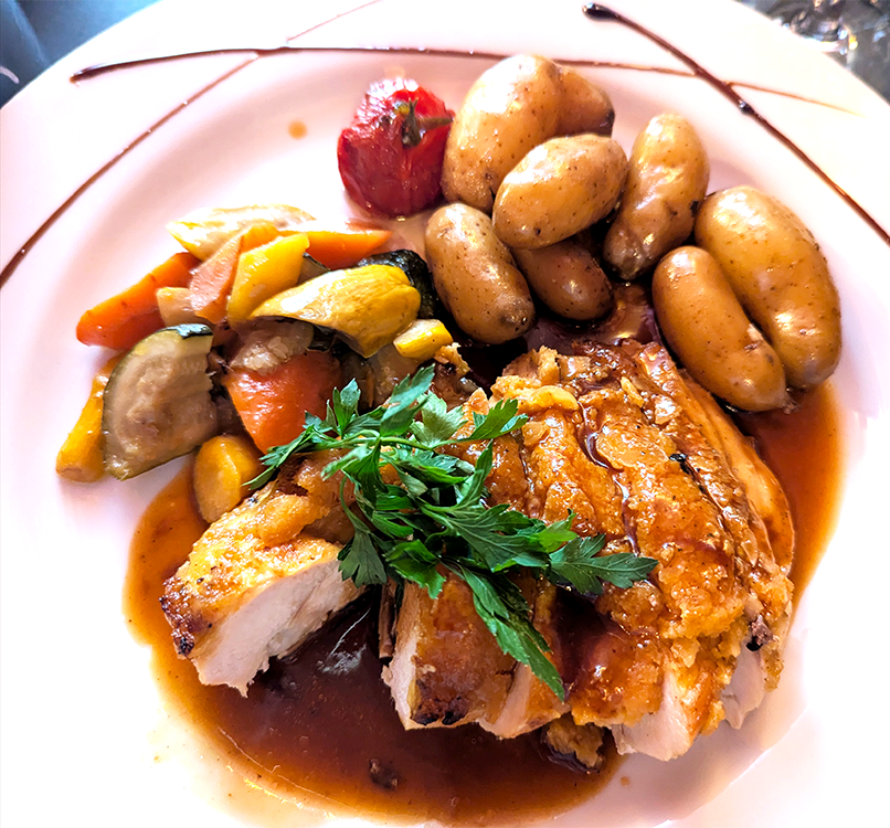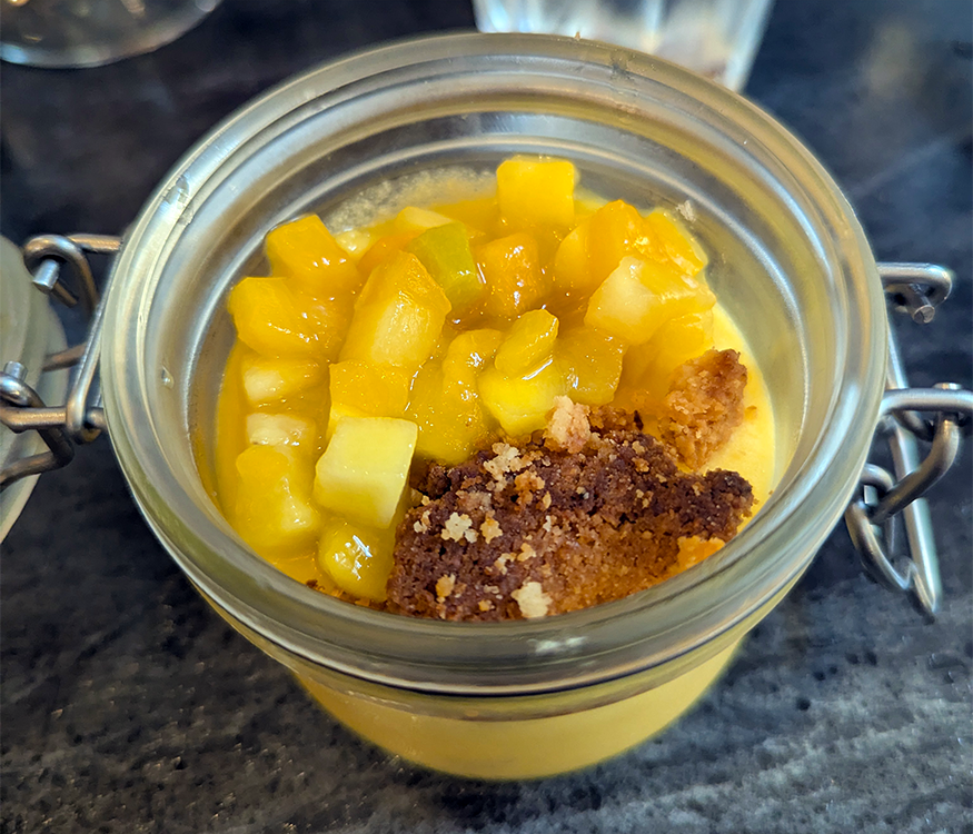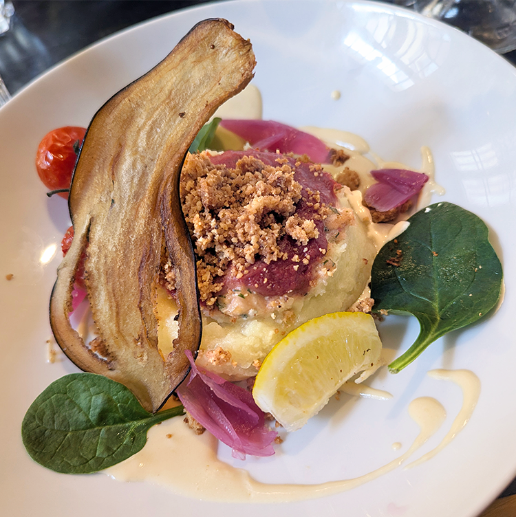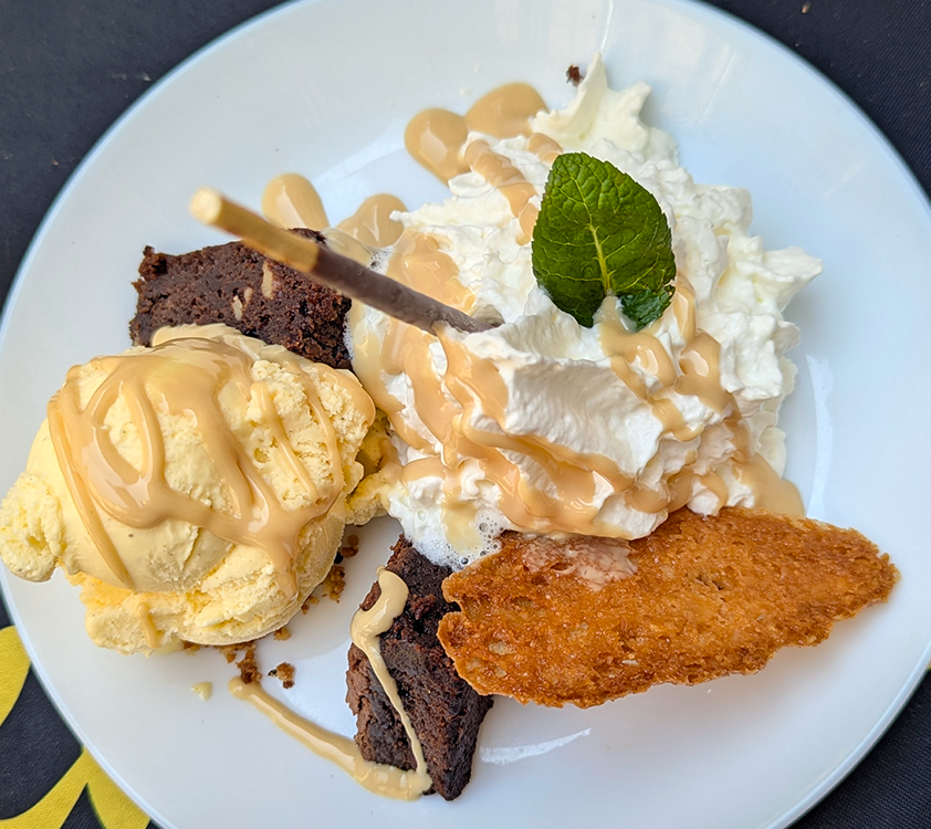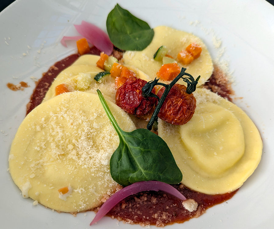 Salmon “crumble” was plated with eggplant prepared two different ways and a creamy, citrusy sauce. Four-cheese ravioli perched atop a bright, fresh tomato sauce. Desserts were a mango mousse and a brownie hidden under a scoop of ice cream and rich whipped cream.