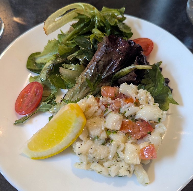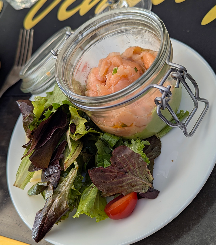 Packed with locals, Le Vintage provided welcome shelter on a rainy afternoon. Blackboard menus change daily. For starters, we enjoyed orders of a scallop ceviche-like tartare and a salmon tartare.