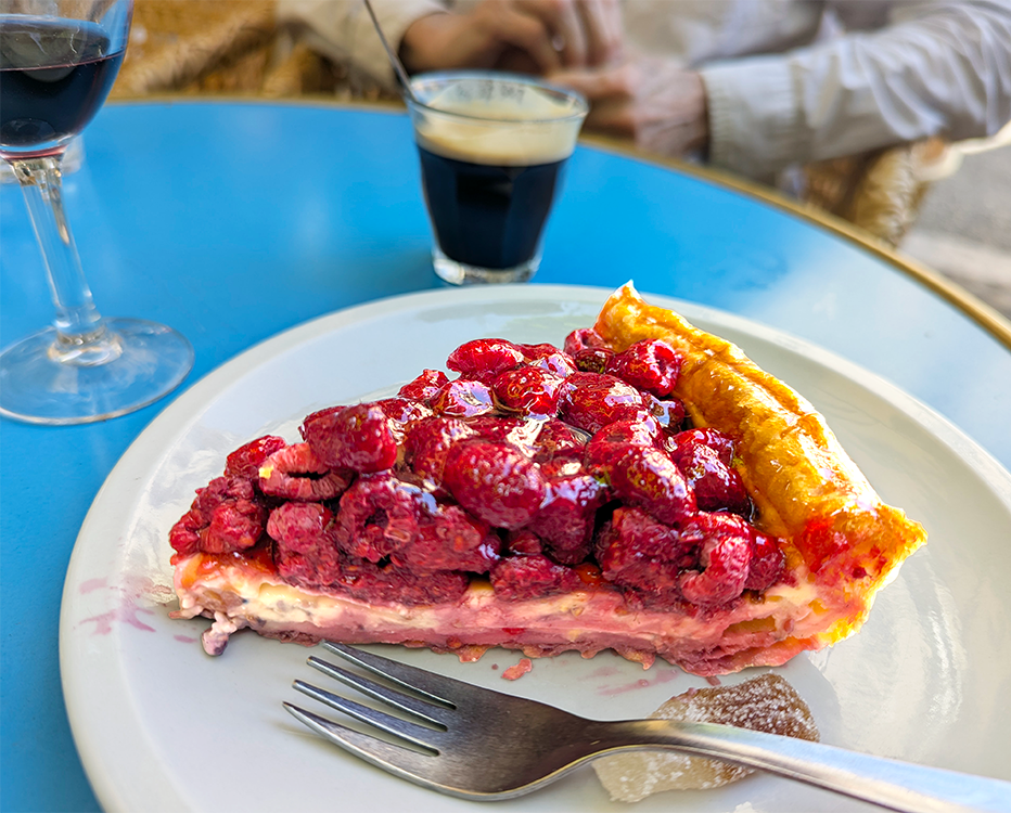 L’Epicerie de Ginette is more a cafe than a restaurant, but its seating on the tree-shaded plaza across the street is ideal for people-watching. Caramelized goat cheese on toast atop a salad was substantial, while a croque monsieur was spartan, a slim slice of ham and a paucity of cheese. The luscious raspberry custard tarte represented redemption. Perhaps best to stick with dessert and people-watching.