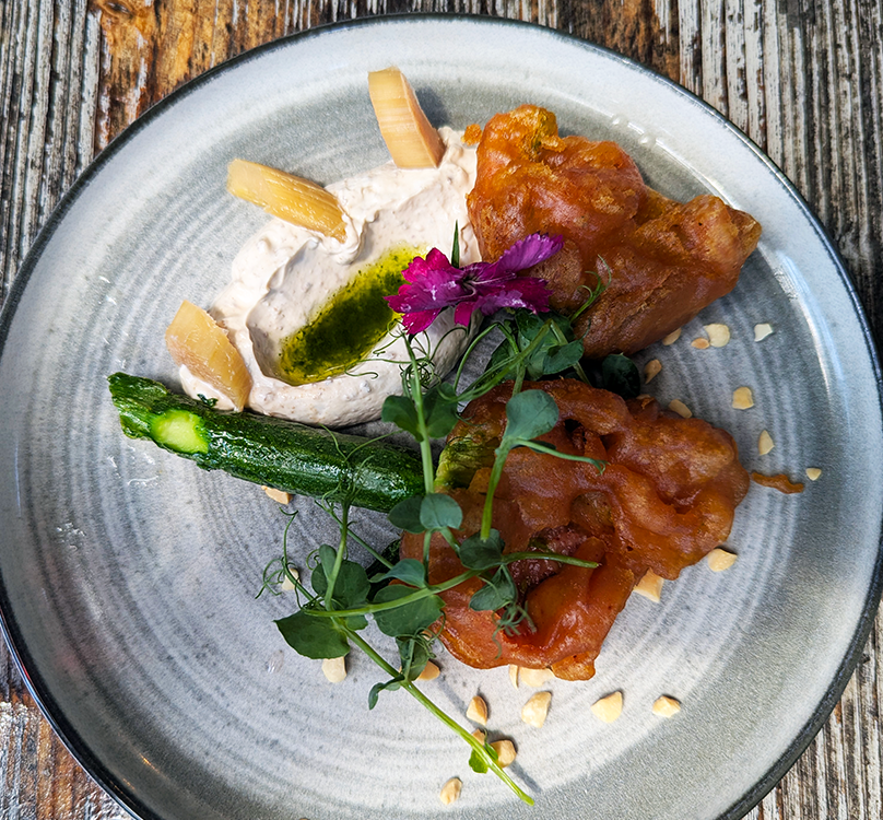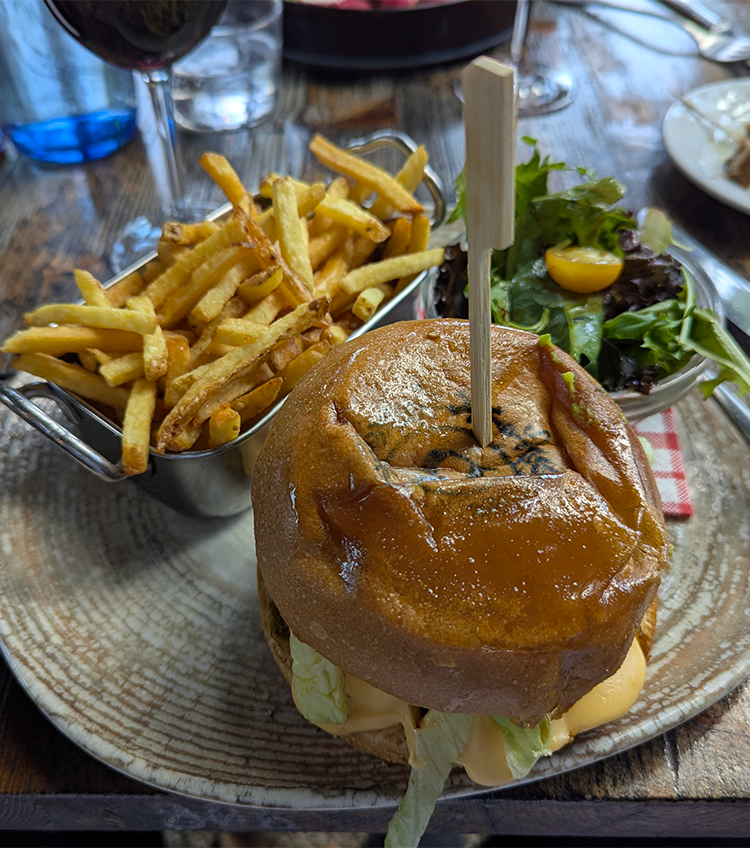 Tempura battered zucchini blossoms arrived with a labne and citrus hummus sauce with rhubarb pickles. A beautiful and varied vegetable bowl more than met our intense cravings. No bun could withstand the assault by the toppings mounded on the expensive bistrot hamburger – a pepper confit, lettuce, guacamole, caramelized onions and a seismic eruption of cheddar sauce. Crisp, naked french fries fared far better.