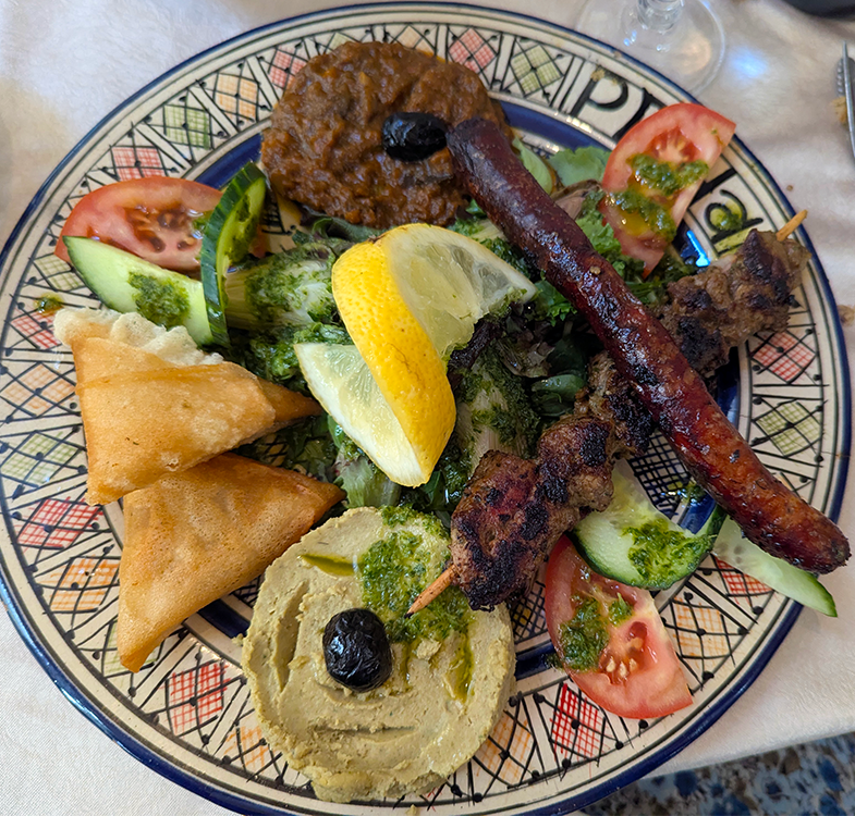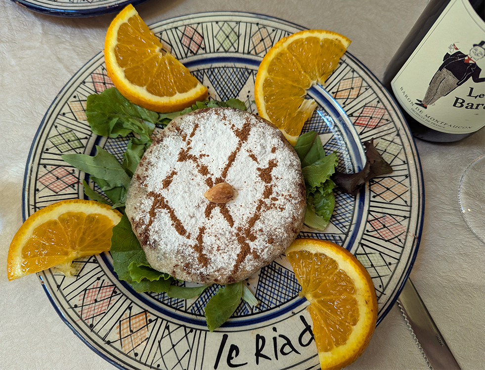 We chose a pastilla once again; a salad sampler with lamb; and a lamb shank with chickpeas and couscous. The fare was fine, just not outstanding at this Le Riad. In a restaurant in the United States we’d label it great, but we’d been spoiled in Aix.