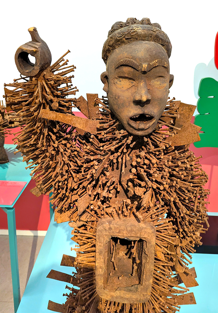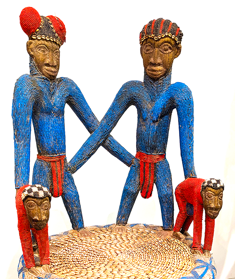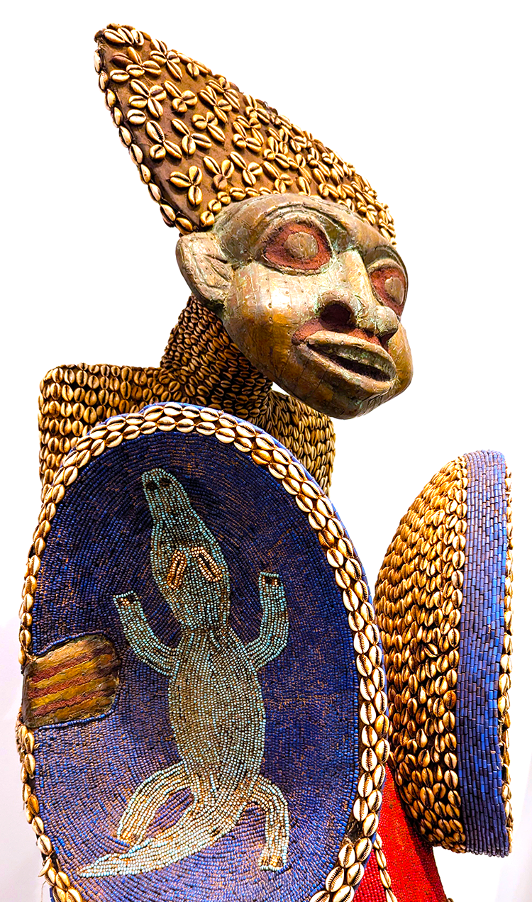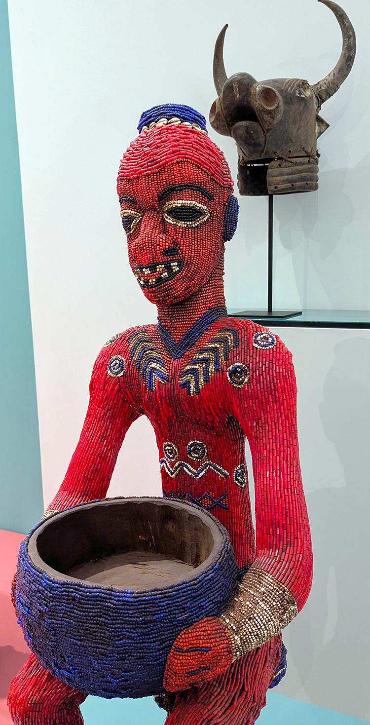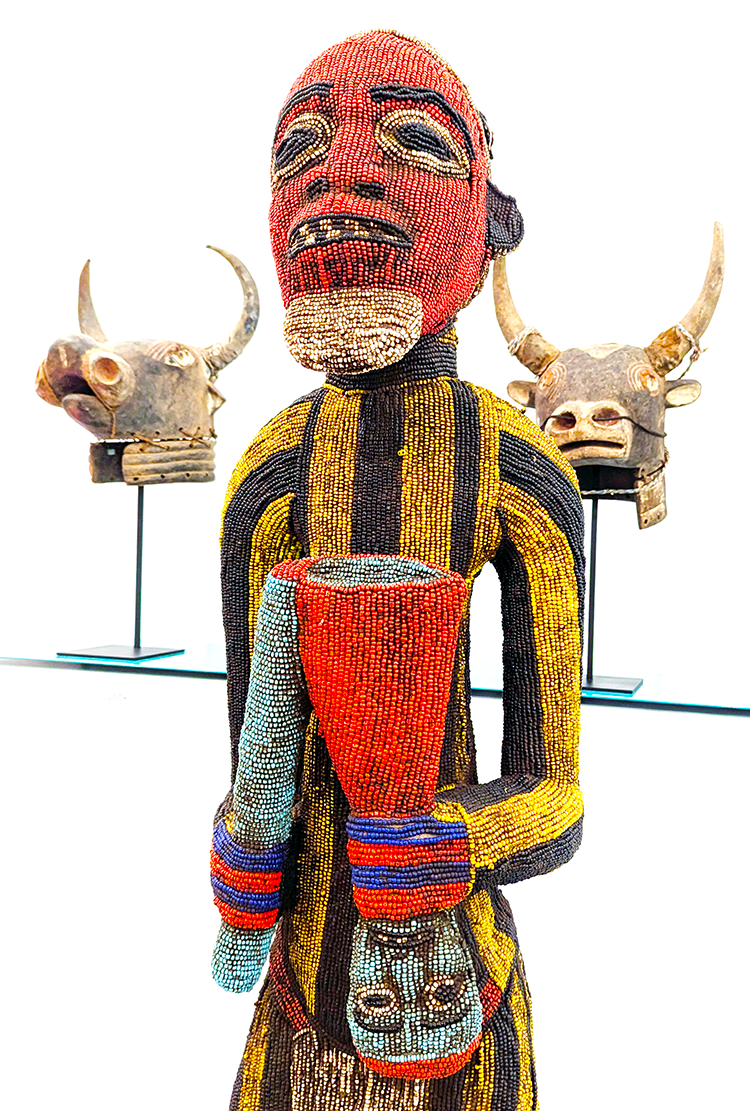 Above: Beaded Bamileke warrior, Cameroon, Central Africa, on exhibit in Jose de Guimaraes International Arts Center.