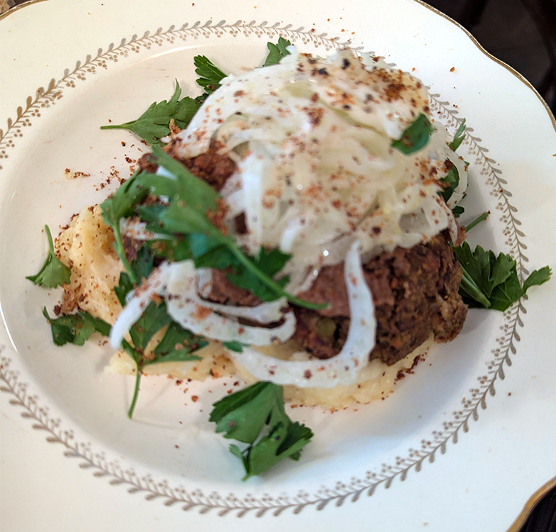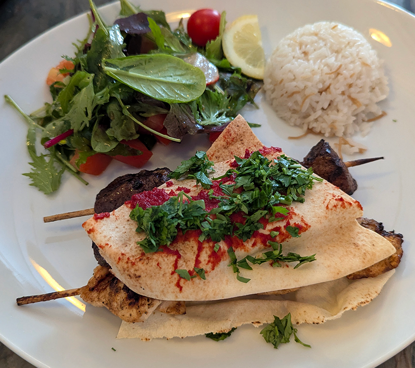 Assanabel’s hummus is a soft cloud of chickpea puree with an abundance of fresh lemon and parsley encircling a pool of rich sesame oil. Mezzes galore and numerous types of fritters beckon, but there’s a limit on how much you can consume in one meal. We opted for kebbe krass – cracked wheat hulls stuffed with minced meat, walnuts and pine nuts. Our mixed grill featured skewers of grilled lamb, chicken and kafta, minced meat. A lot of meat after the plump kebbe.
