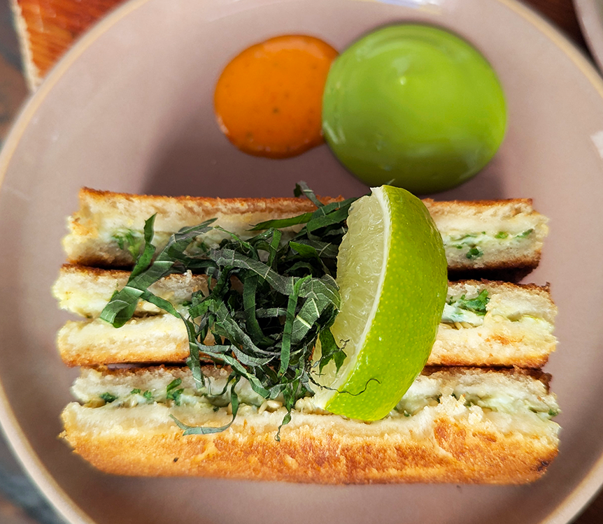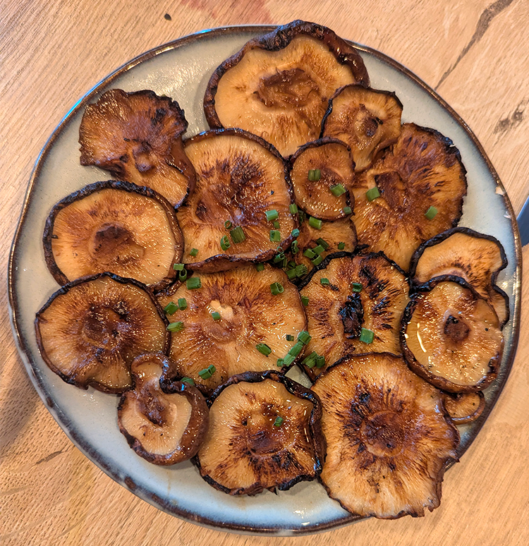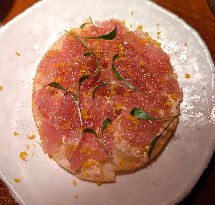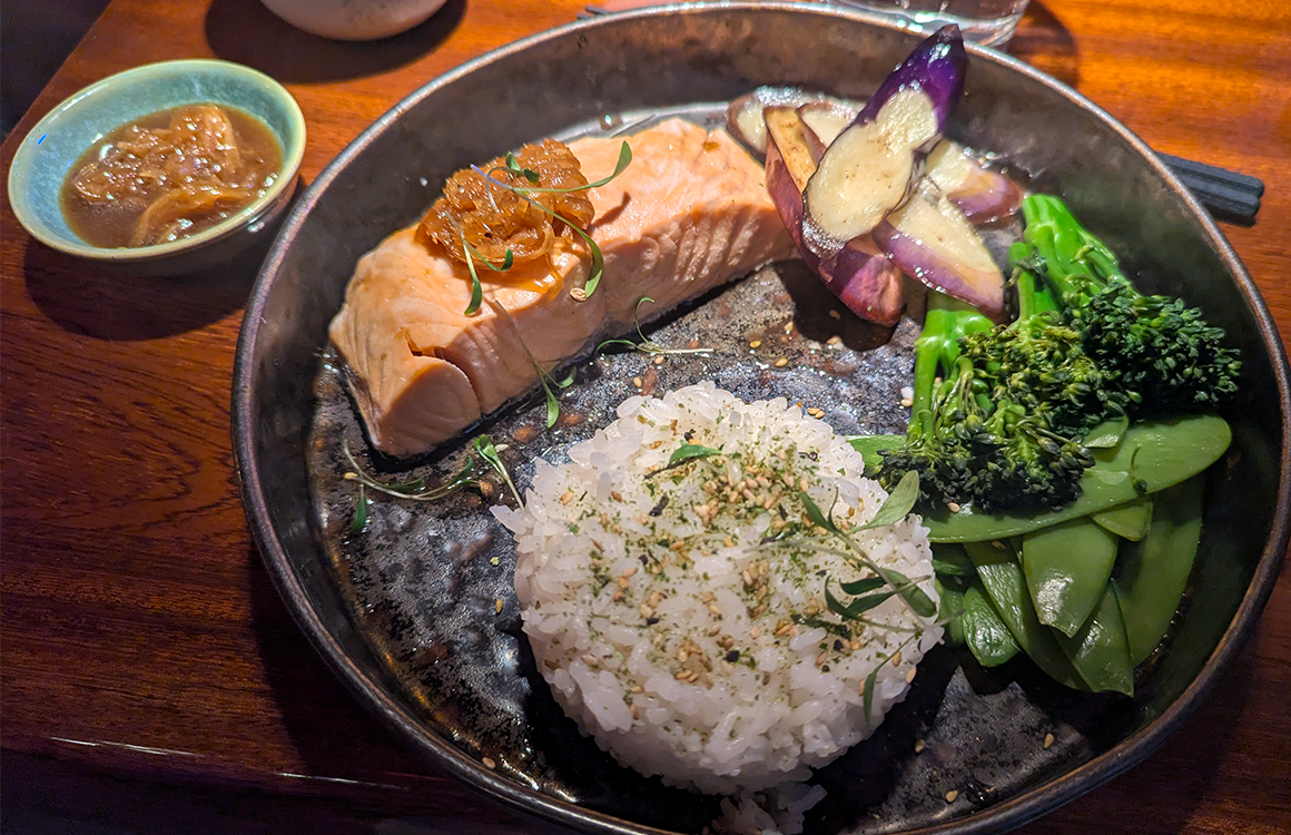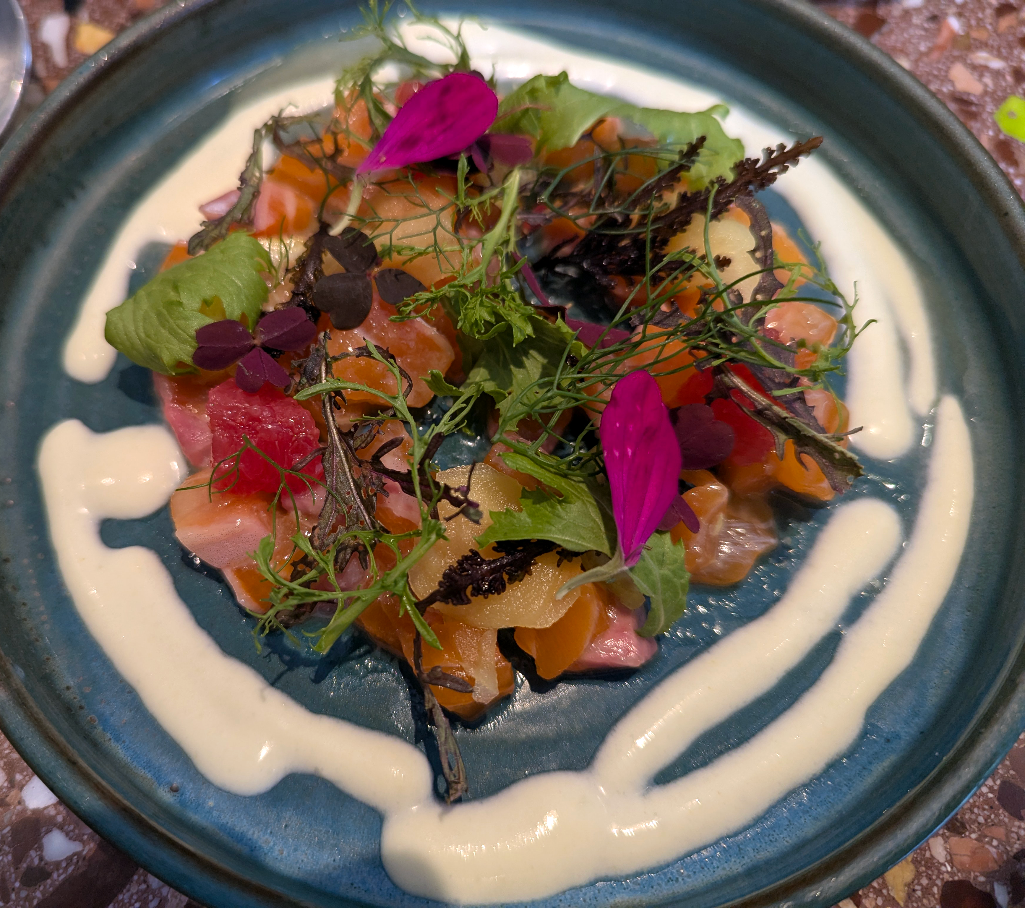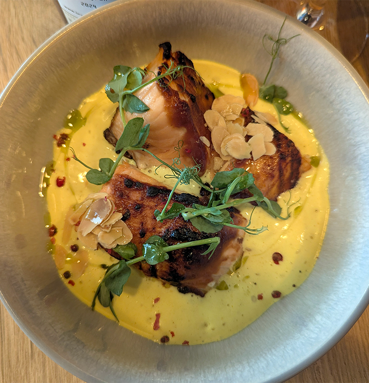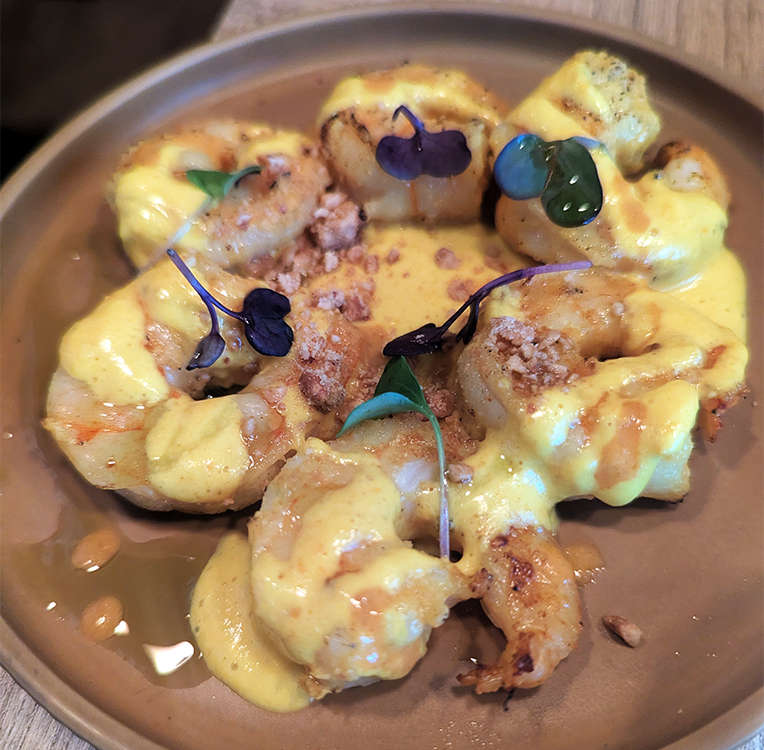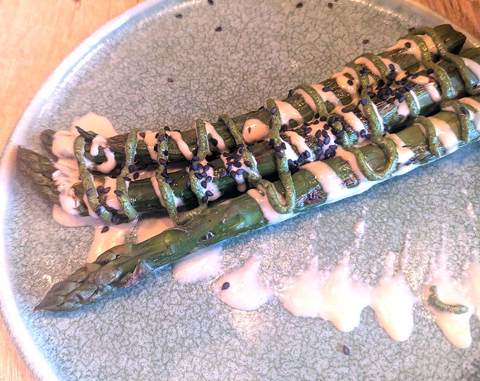 Tahini verde and miso aioli zigzagged across juicy, plump asparagus. Grilled shitake mushrooms were amazing. An emulsion of coconut milk, ginger and cucumber enhanced perfectly cooked salmon, and a yellow garlic and mild chile sauce topped a Vietnamese-style shrimp dish. Again, wish we could have tried more.