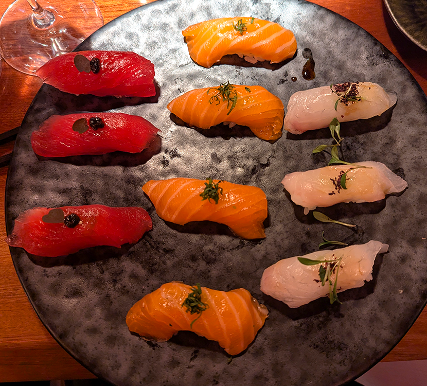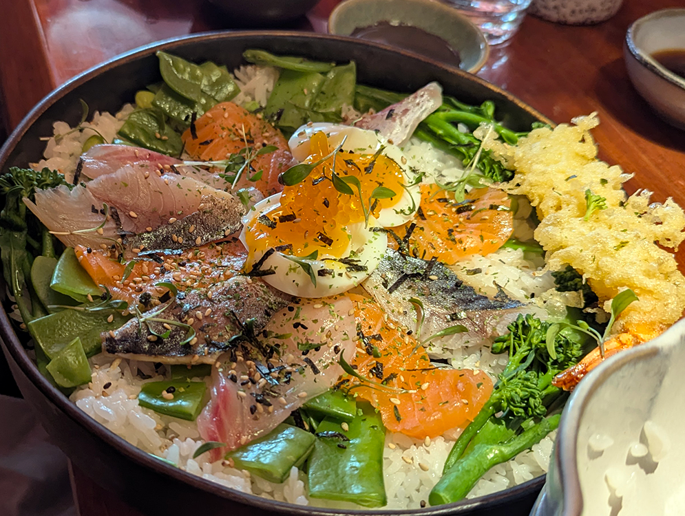 The geisha, sort of a thin crispy pancake, was topped with a taramasalata sauce, tuna sliced so thinly as to be sheer and bottarga, crumbles of dried fish roe creating a balance of both delicate and intense bursts of flavor. Whether sashimi, nigiri or chirashi, the freshness of the seafood shimmers in the photos below. The plate with the egg crowned with golden caviar pearls is a lunchtime version of omakasa, served as a sampler platter instead of in courses. The male teens at our table each polished off one, pronouncing it their favorite meal in Paris.