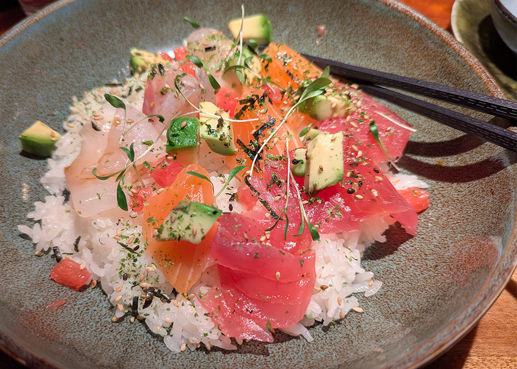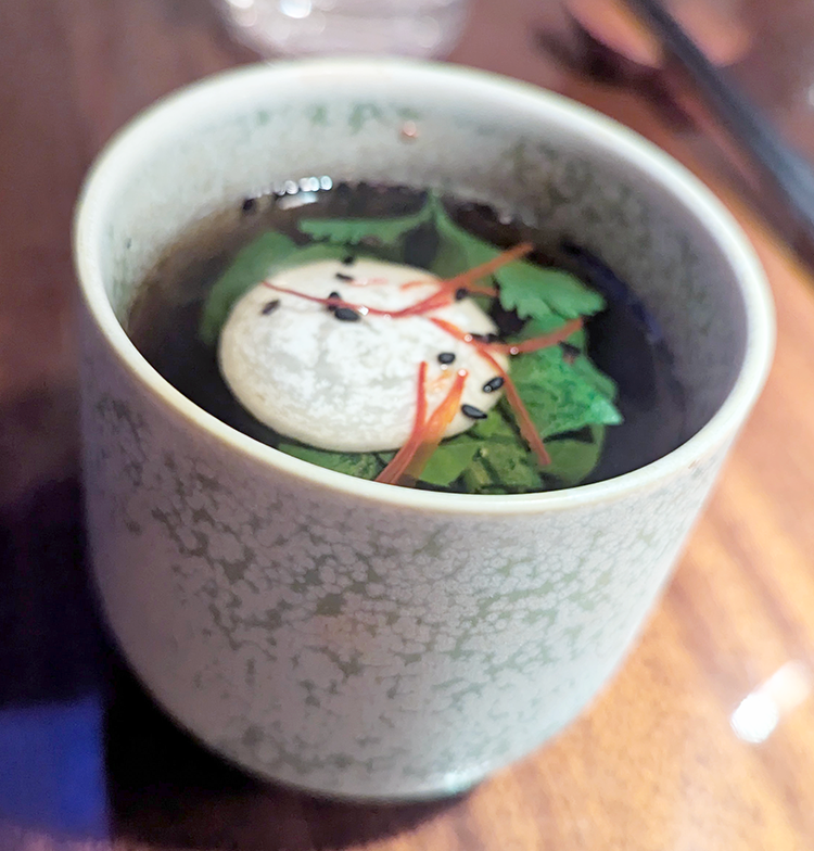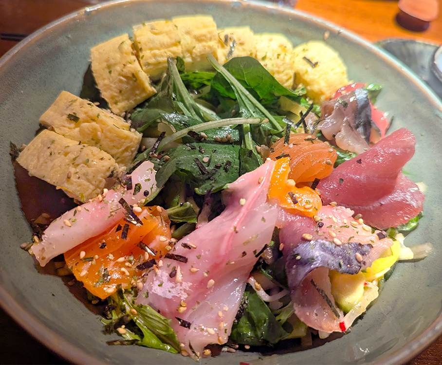 I always enjoy the comfort of a cup of miso as an amuse-bouche but never have I tasted any as flavorful as Blueberry’s buckwheat broth – so good one person in our group ordered an entire bowl after tasting it. I’ve never found the sweetness or texture of tamagoyaki, or Japanese omelettes, appealing, but Blueberry’s crab version paired on a salad plate with sashimi changed my opinion.