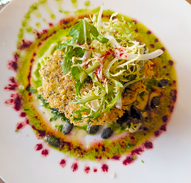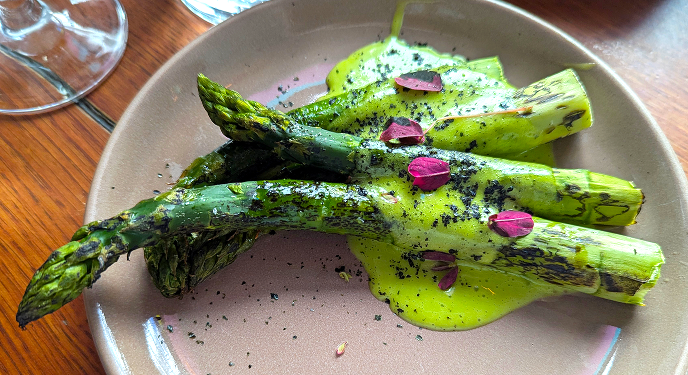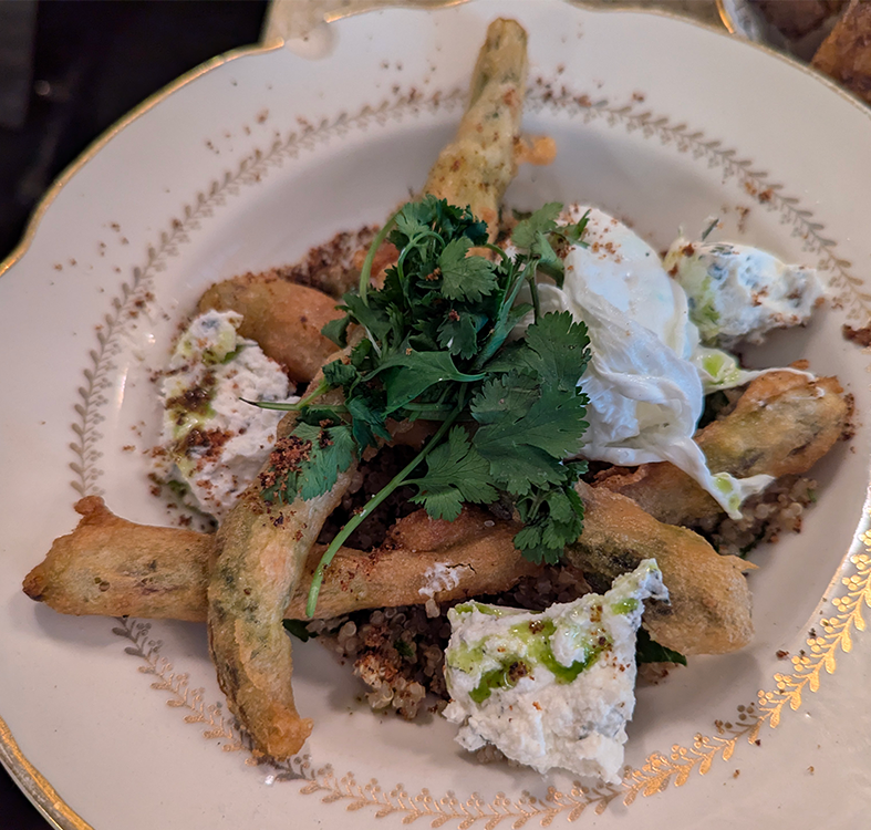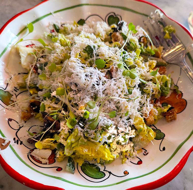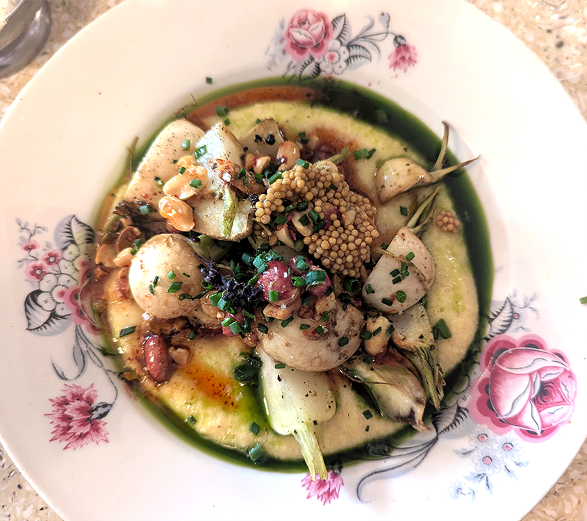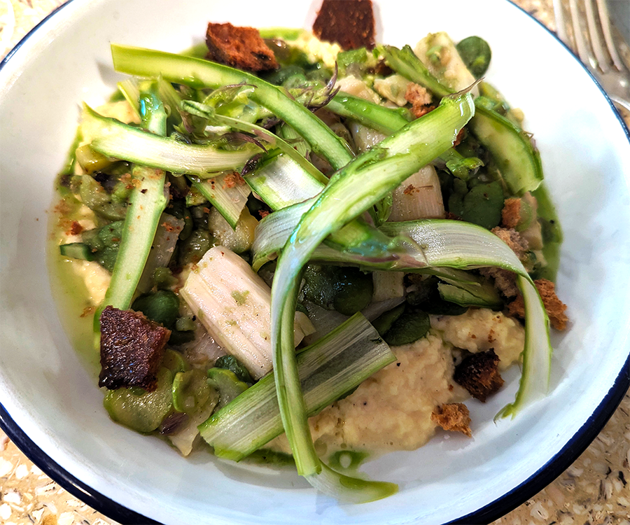 Spring peas, fennel, rhubarb and mint were combined in a new-moon tartare. Slivers of asparagus, beans and crusty croutons topped creamy scrambled eggs. Asparagus tempura were astride a quinoa salad accented with a fresh tarragon cheese and a poached egg. I can’t remember the ingredients in the dish of baby turnips and pureed celery root, as the bowl emptied too quickly. On another occasion, baby turnips and chard were paired with slices of smoked chicken in a dark, spicy bouillon.