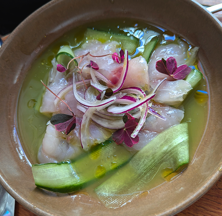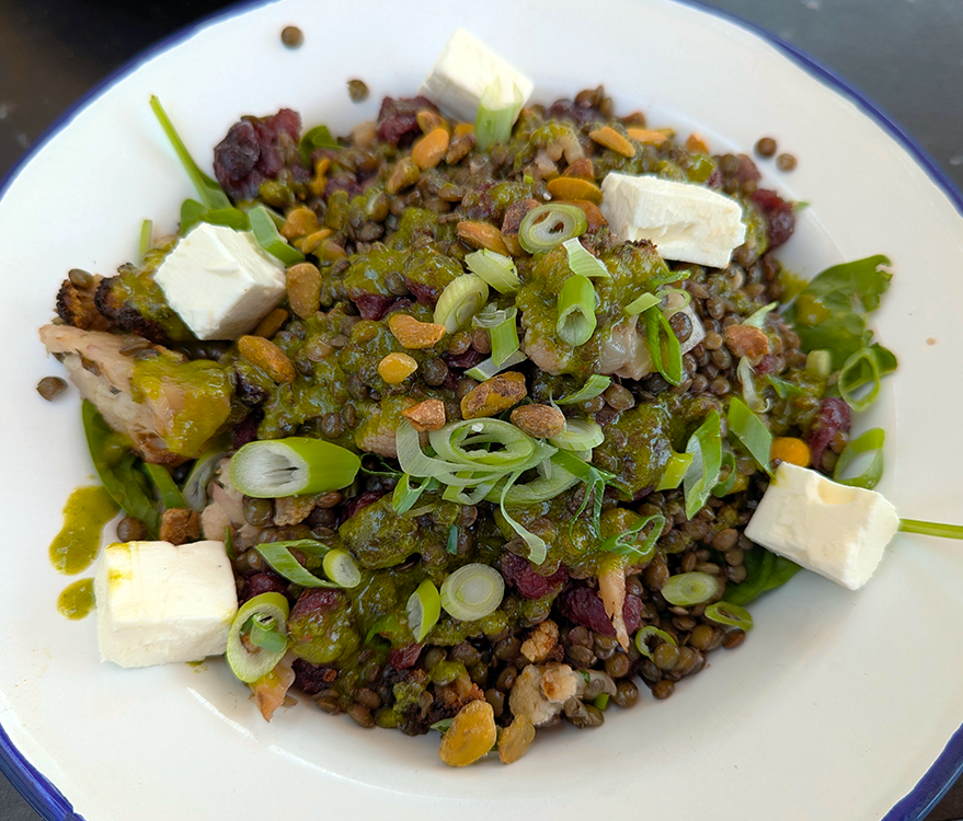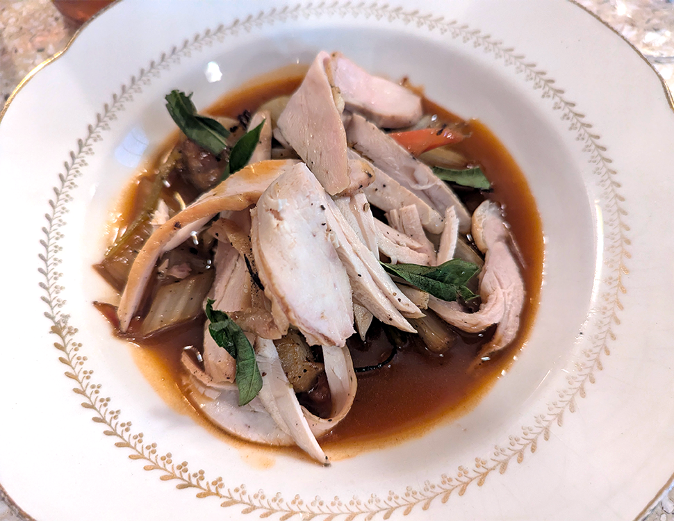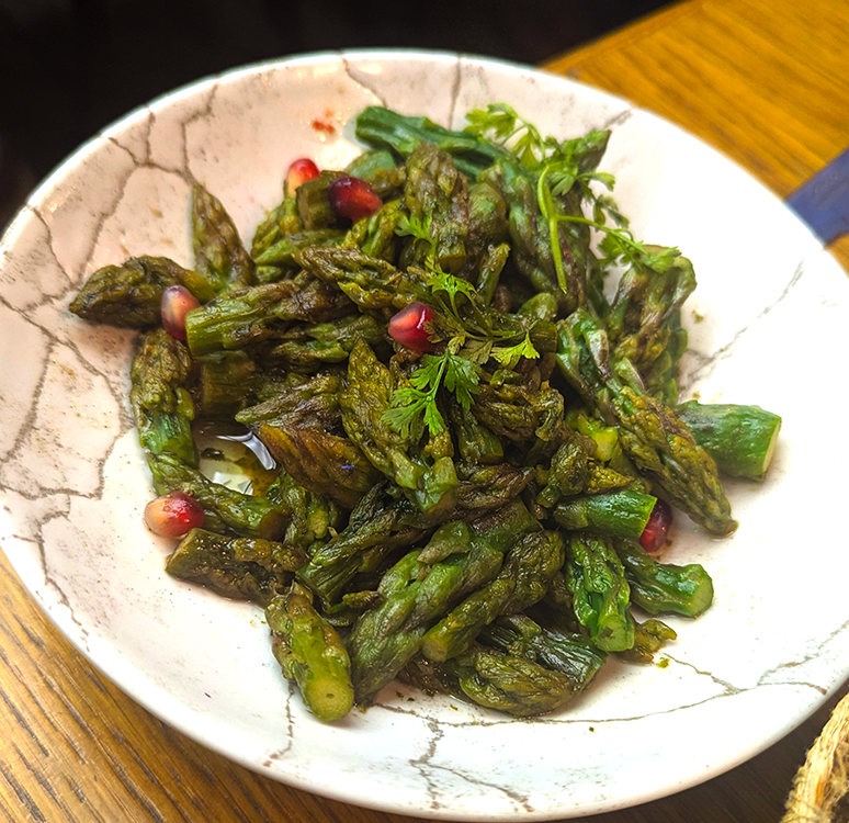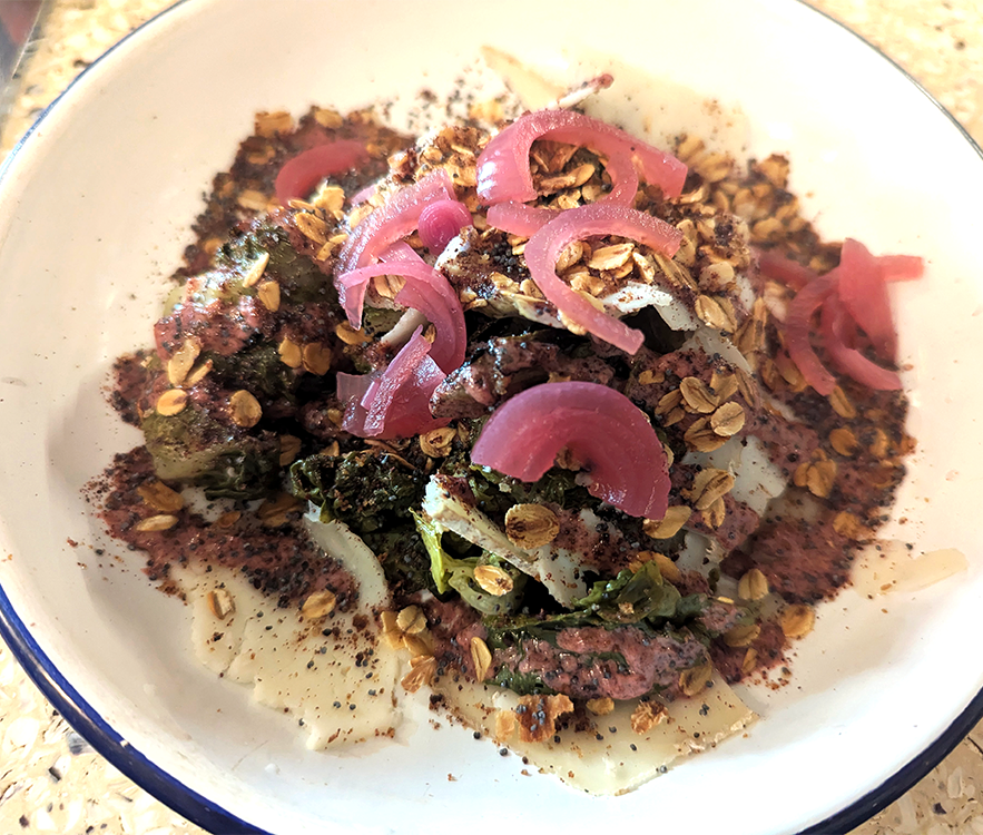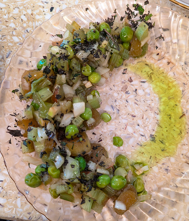 Spring peas, fennel, rhubarb and mint were combined in a new-moon tartare. Slivers of asparagus, beans and crusty croutons topped creamy scrambled eggs. Asparagus tempura were astride a quinoa salad accented with a fresh tarragon cheese and a poached egg. I can’t remember the ingredients in the dish of baby turnips and pureed celery root, as the bowl emptied too quickly. On another occasion, baby turnips and chard were paired with slices of smoked chicken in a dark, spicy bouillon.