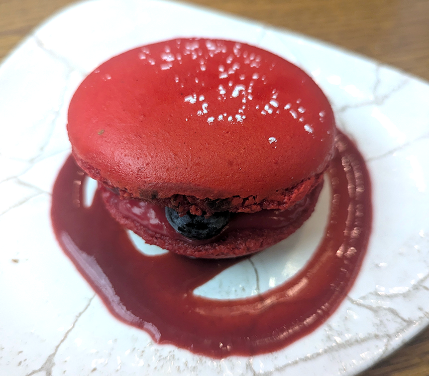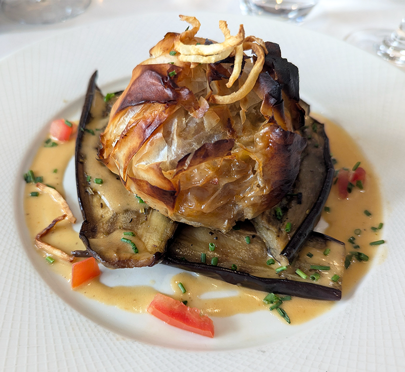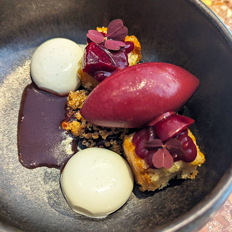 For dessert, an apple tarte was topped with a nut crumble and surrounded by a milky caramel sauce. Our other dessert selected featured apples roasted and colored by black currents with a dark chocolate and violet liqueur sauce.