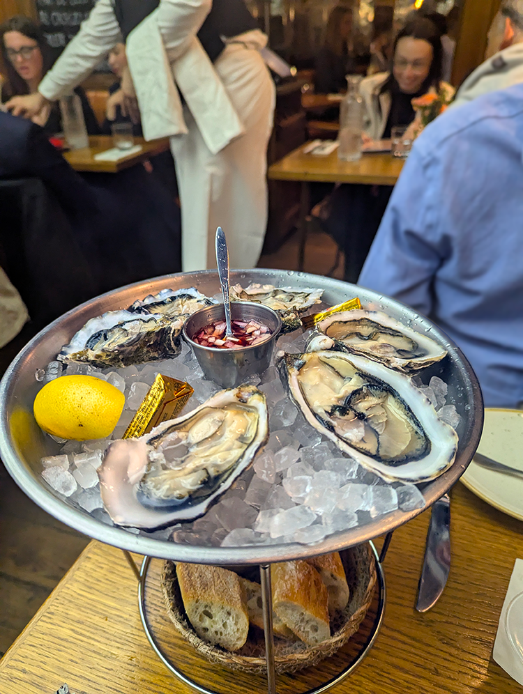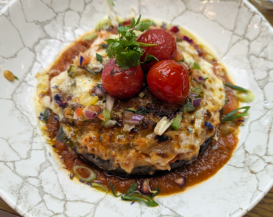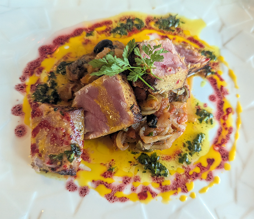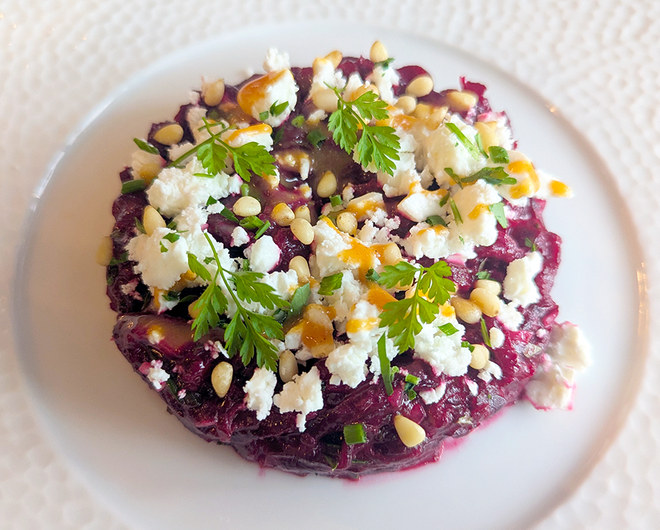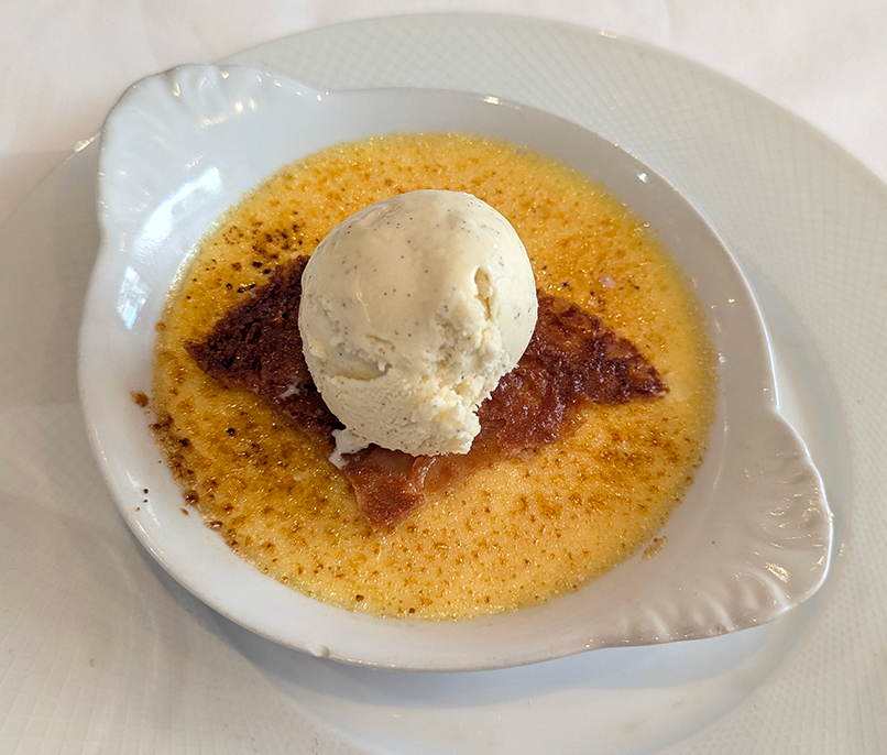 Multiple kinds of freshly shucked oysters, including the pictured Utah Beach No. 2s, were luscious. Eggplant stuffed with ratatouille and rice could be the pride of almost any vegetarian restaurant. I’m not sure where the rest of the asparagus went, but a plateful of fresh tips was a pleasure to polish off. Salmon was paired with a layer of robust red pesto, and duck set aflame made an ooh-la-la impression.