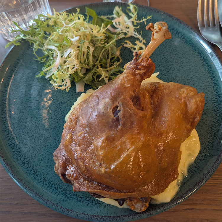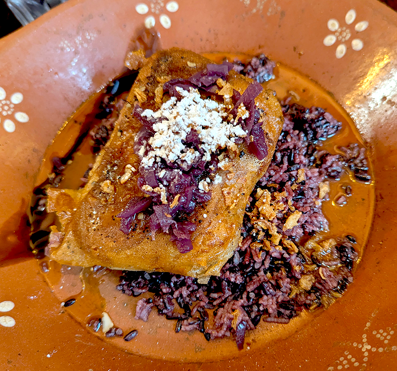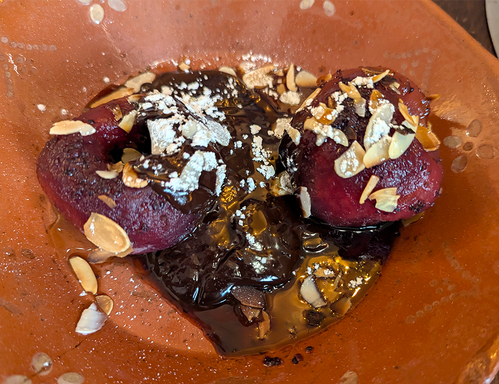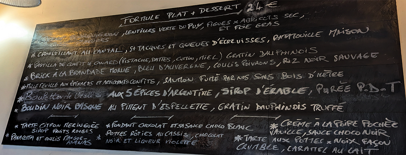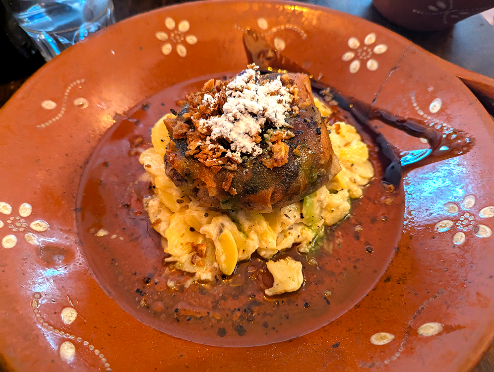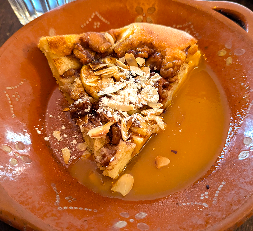 The daily “formule” printed on a large blackboard evidenced frequent changes. A pastry “brick” encompasses a filet of cod, sprinkled with blue cheese atop a bed black wild rice and a red pepper puree. Continuing on a jag of distinctive pastillas, the alchemist lurking in the kitchen concocted one filled with duck confit, pistachios, dates and honey atop a traditional French potato gratin dauphinois. Somehow all this category-defying fusion works.
