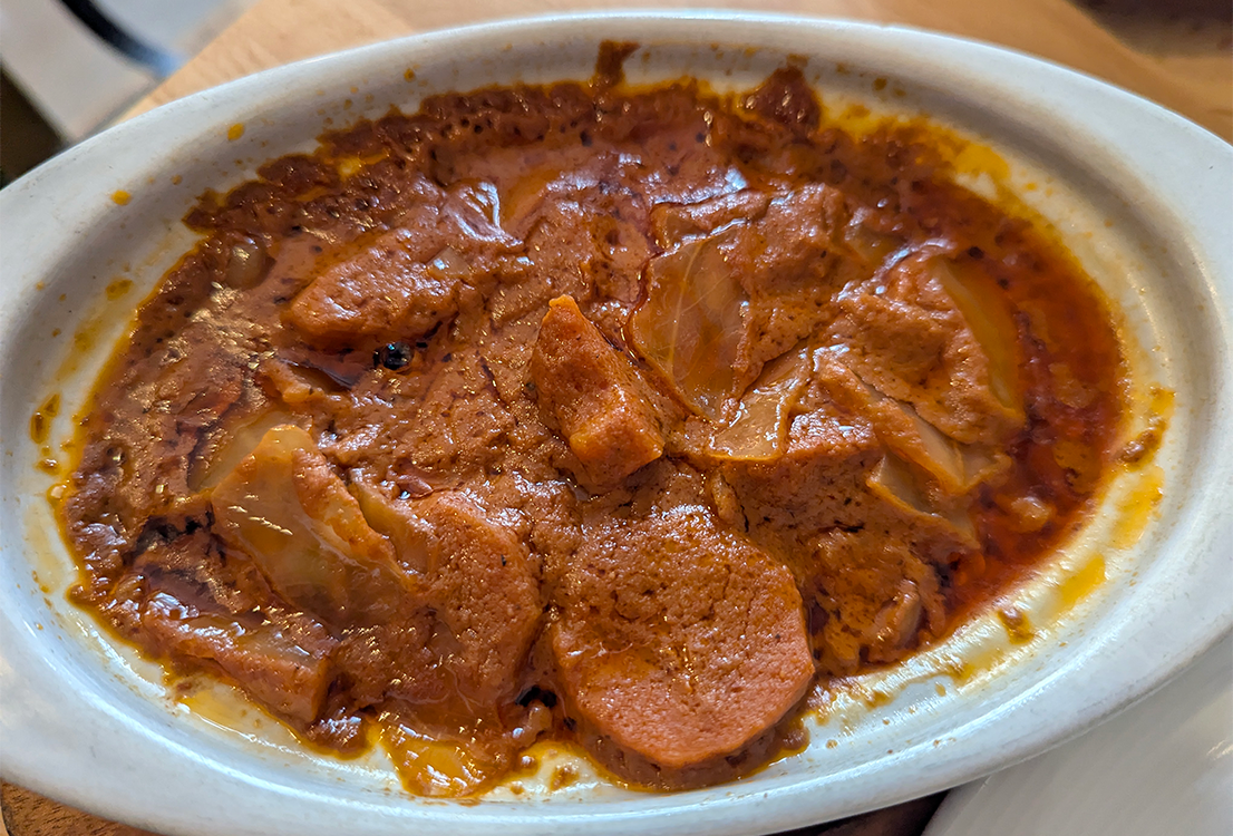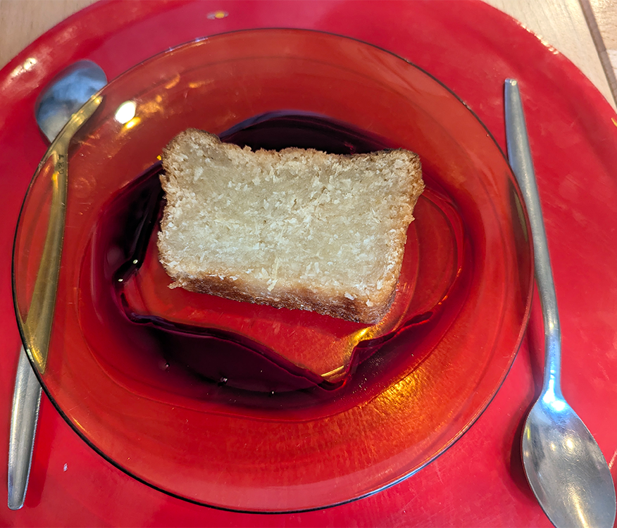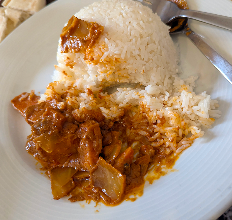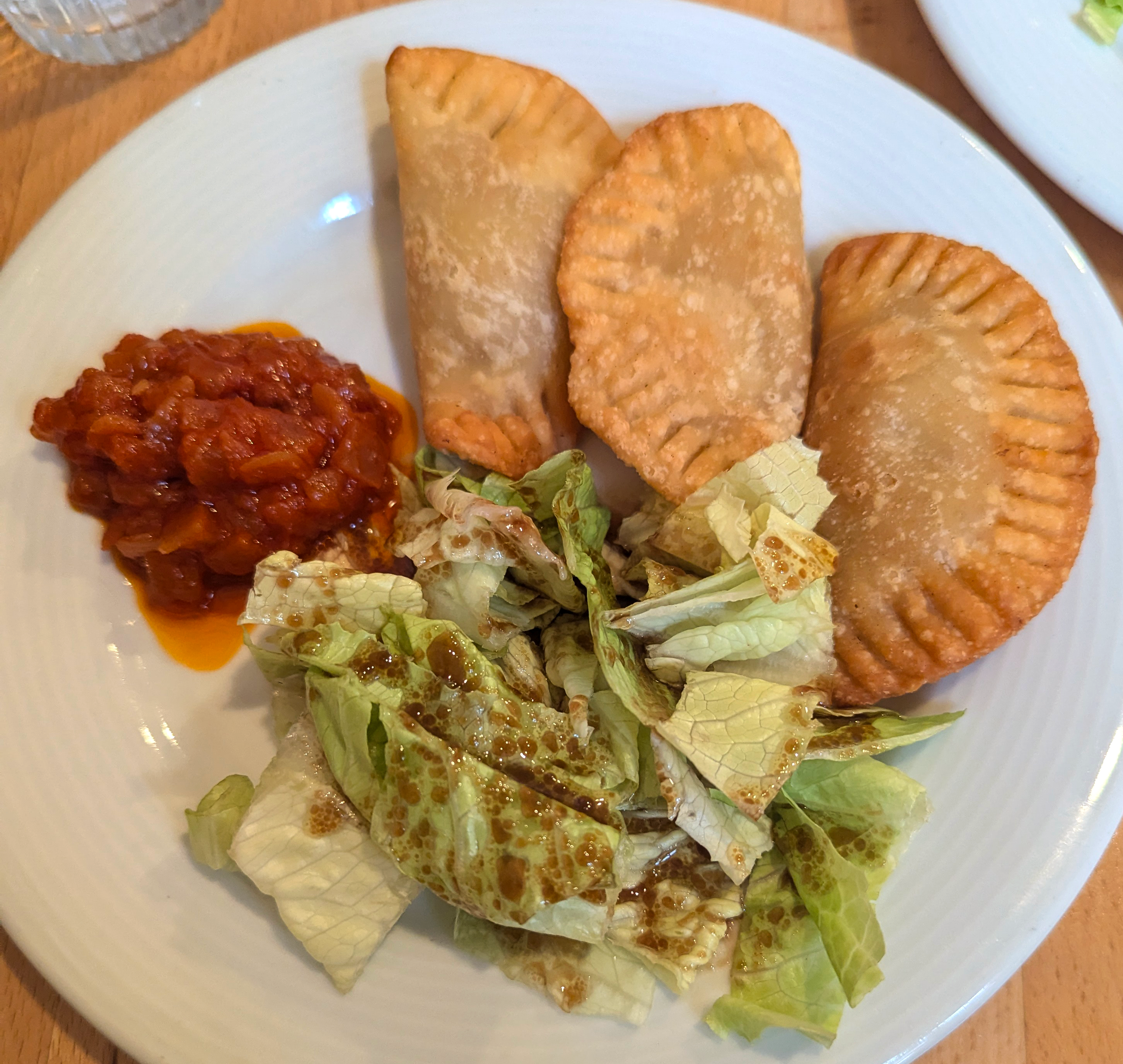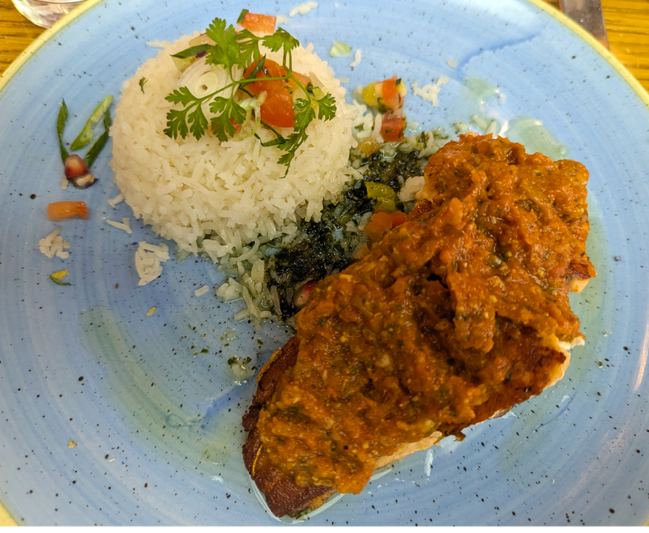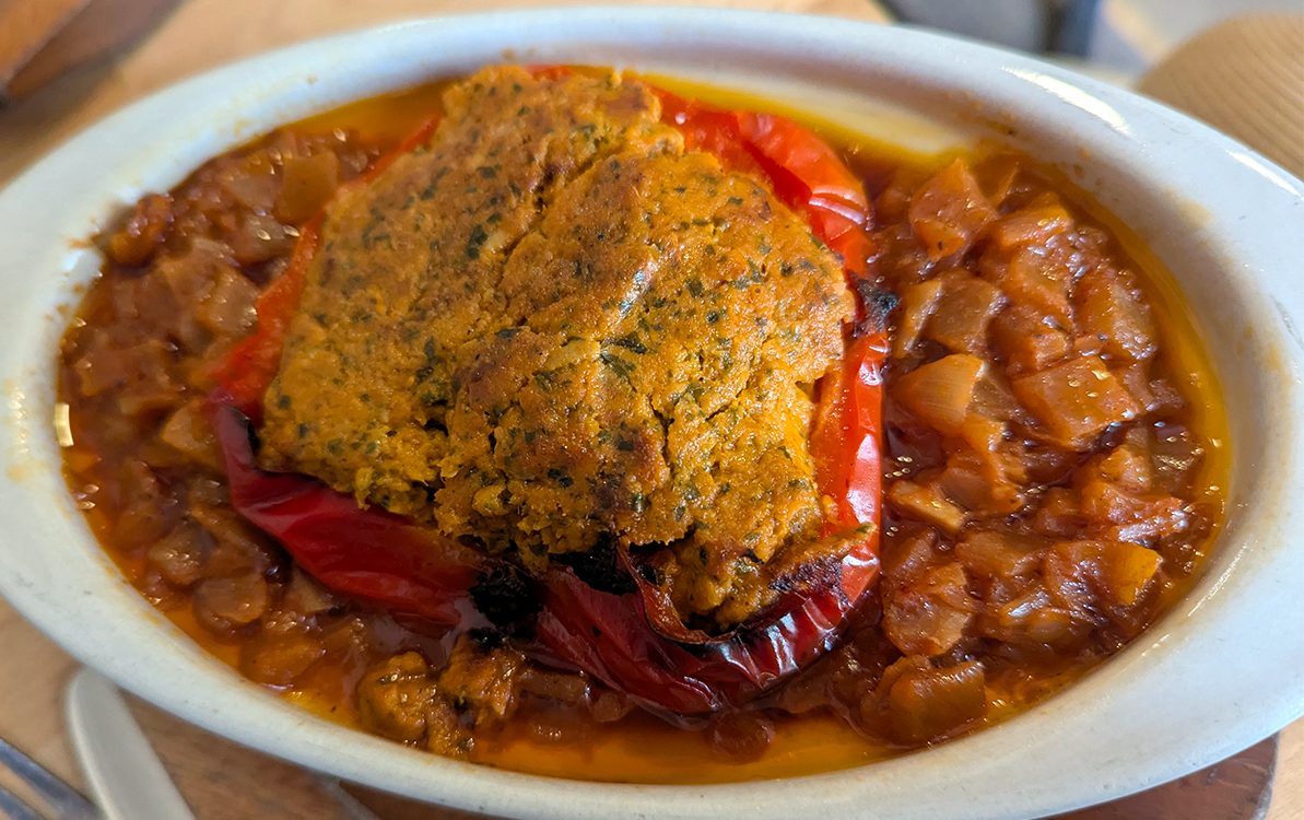 Entrees we tried included a large red pepper filled with a spicy fish mixture surrounded by saucy vegetables. Mafe, a thick peanut-buttery tomato sauce, was available in a beef or vegetarian version loaded with sweet potatoes and rice on the side. The only dessert we tried was a pleasantly sweet slice of leche-soaked coconut cake. Plan ahead, which we did not, to reserve a seat on Fridays to try thieboudienne, a one-pot meal that is the national dish of Senegal.