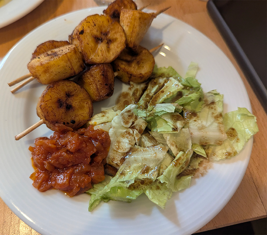 Le Petit Dakar (3rd Arrondissement) introduced us to the melange of spices in Senegalese cooking, enticing us to return to get better acquainted. “Street food” meant to share included fish empanadas and skewers of fried plantains. Grilled vegetables topped a fresh salad.