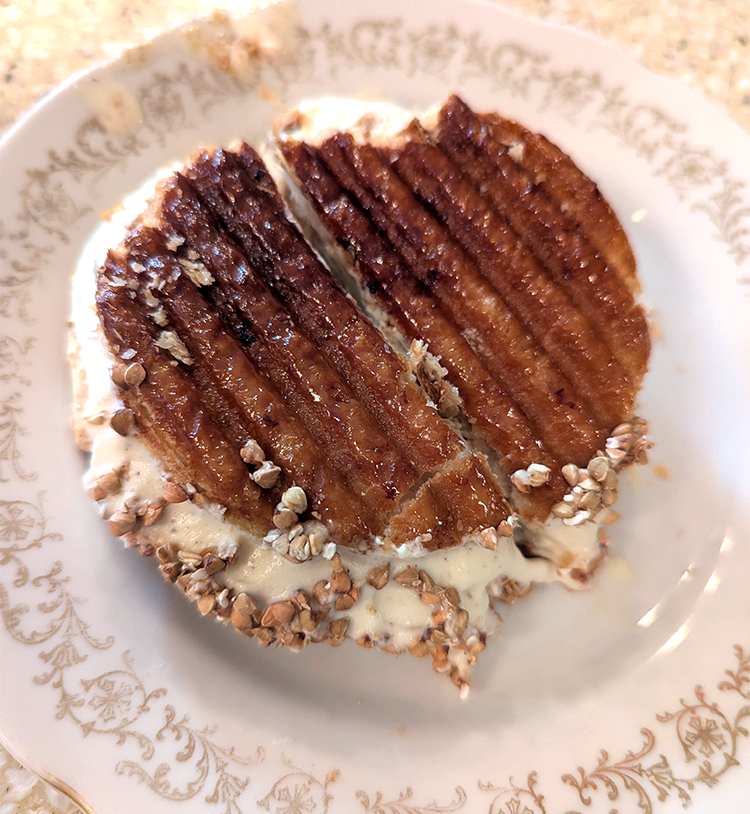 Among other dishes we devoured were a braised baby gem lettuce salad; a potato gallette; and mushroom and chickpea balls in a mole sauce atop smashed potatoes. We only made it to the dessert course once to try the ice-cream sandwich ever-present on the menu. A crispy, honey-glazed buckwheat waffle is stuffed with a super creamy filling studded with hazelnuts. A bit rich to us, but it appeared on every table of regulars.